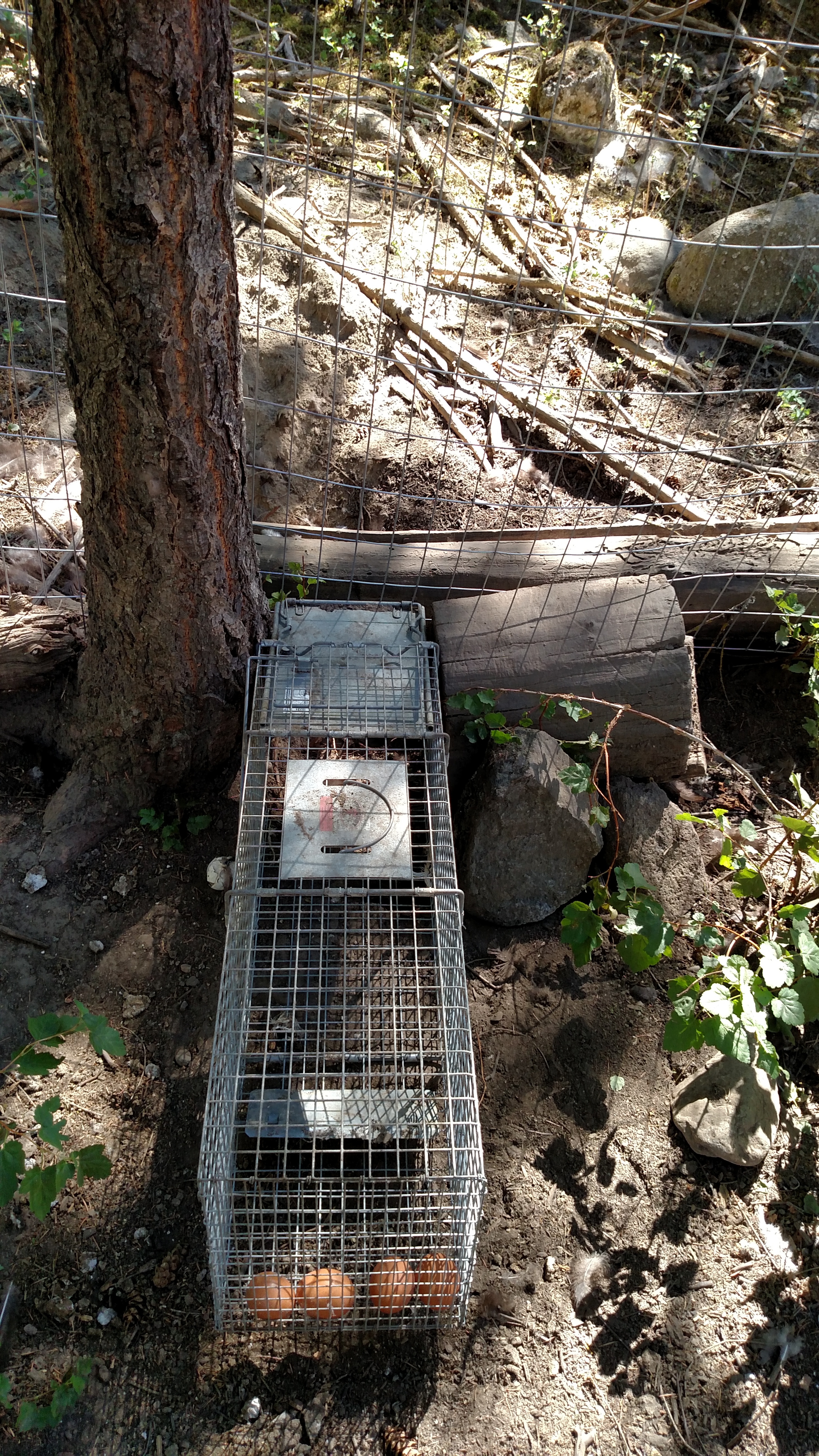 So now I had to set my trap for whatever this thing is. I have a Hava-hart trap and it actually worked out to place it. I set 4 eggs in the very back corner and have the trap locked in place side to side. It has a slight drop off on the back side so that if the thing enters the trap, if it walks to the back, it will tip the cage back slightly and trip the door. These 2 things I hope will ensure the damn varmint is caught. I want to know what has done this, and a little retribution could be possible.