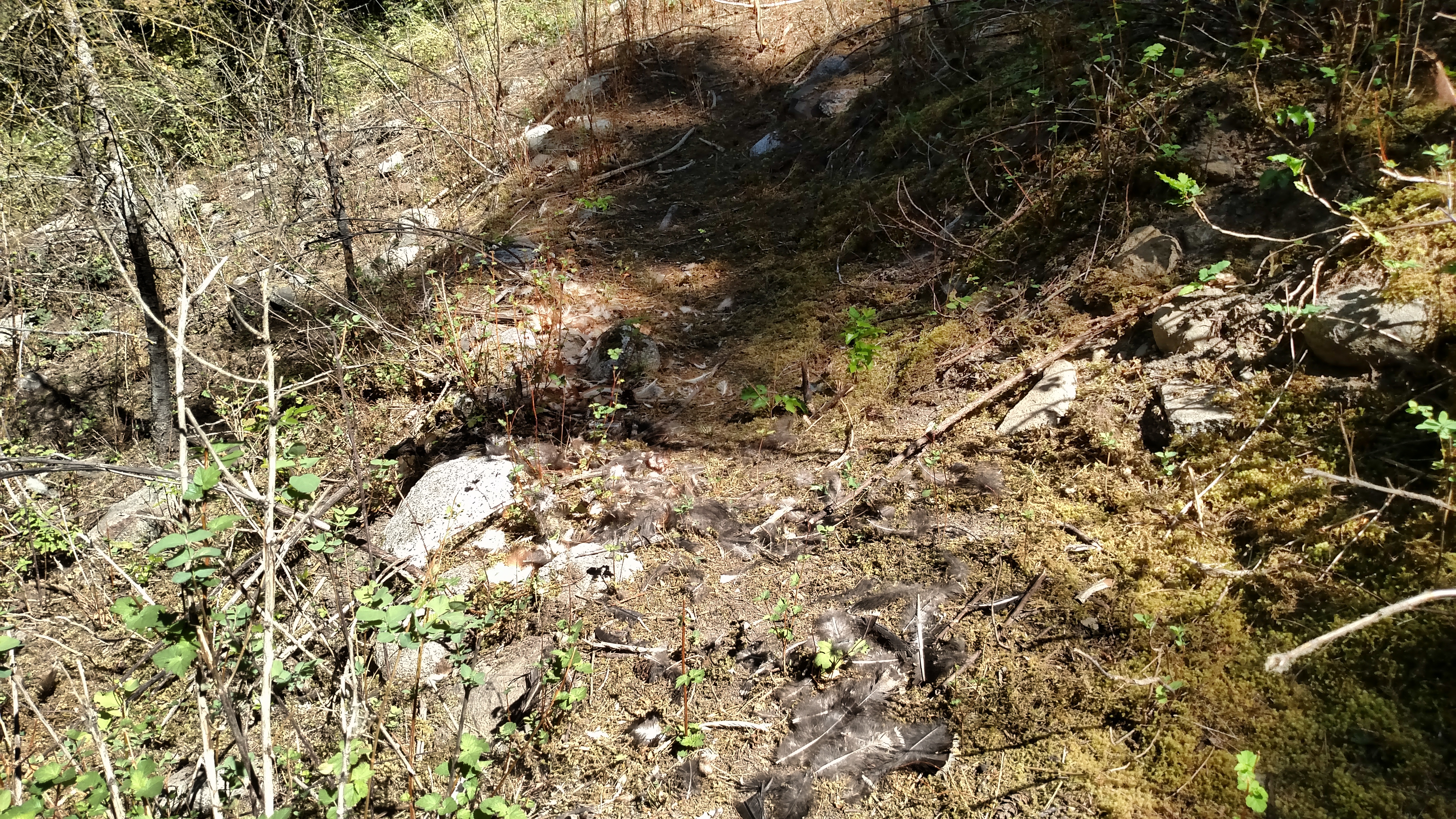 I turned uphill and saw feathers leading up the trail. I followed the trail to the fence line finding more feathers along the way and then another entry point under the fence.
