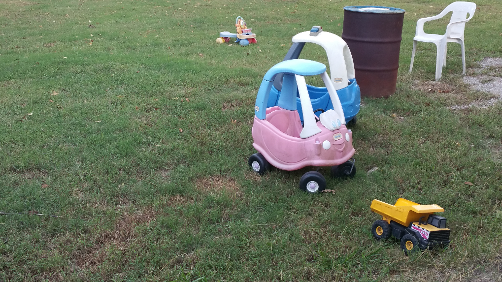 Can you see that ride toy facing the burn barrel? That's my baby sister's ride. We have Tonka trucks and we rode them down the hill. Baby sister had a blast riding down the hill too!