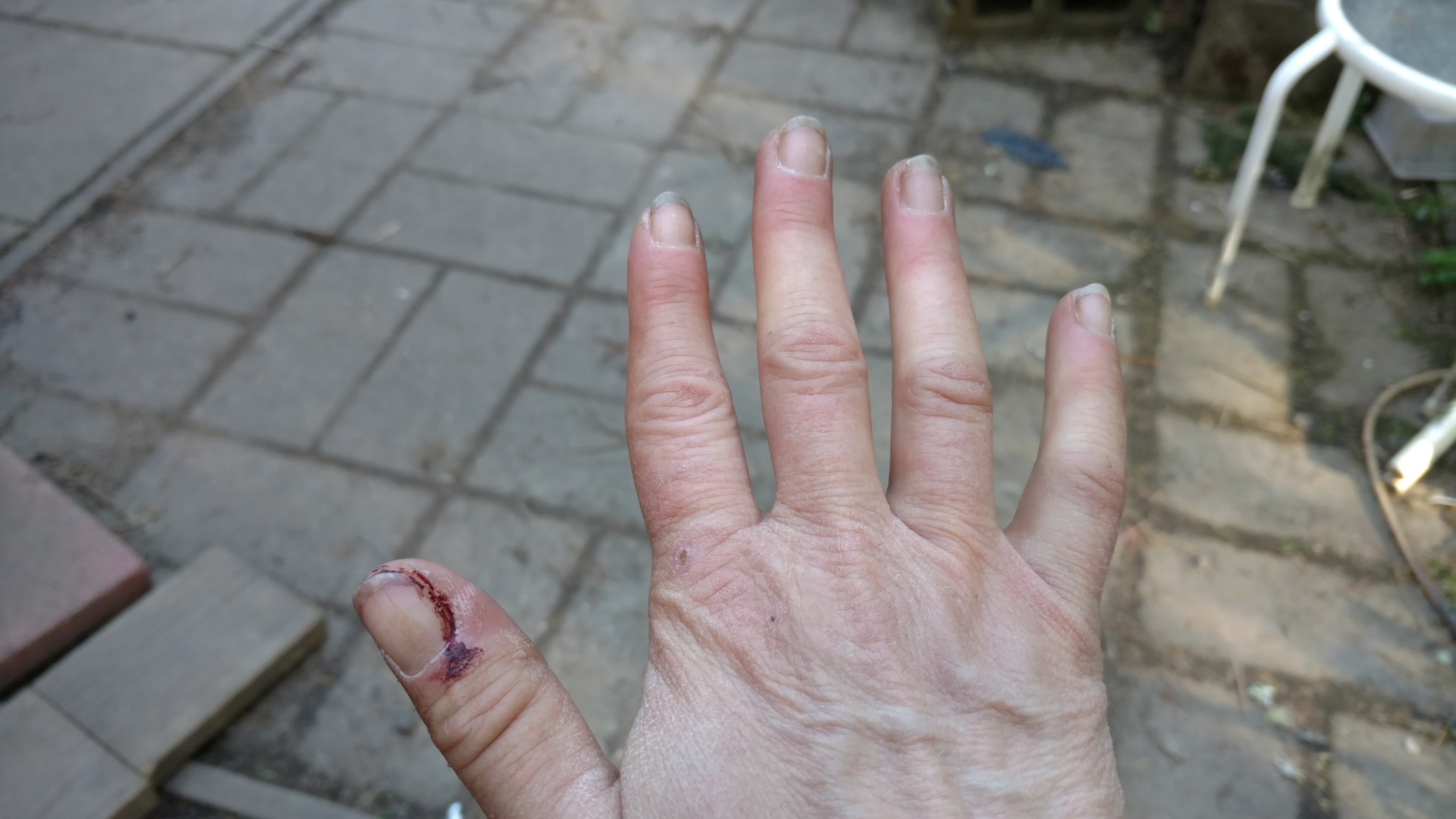 I love this - despite the very painful looking thumb injury. Your hands look about as lovely as mine. But yours are far more capable on the acreage, I'm sure.
