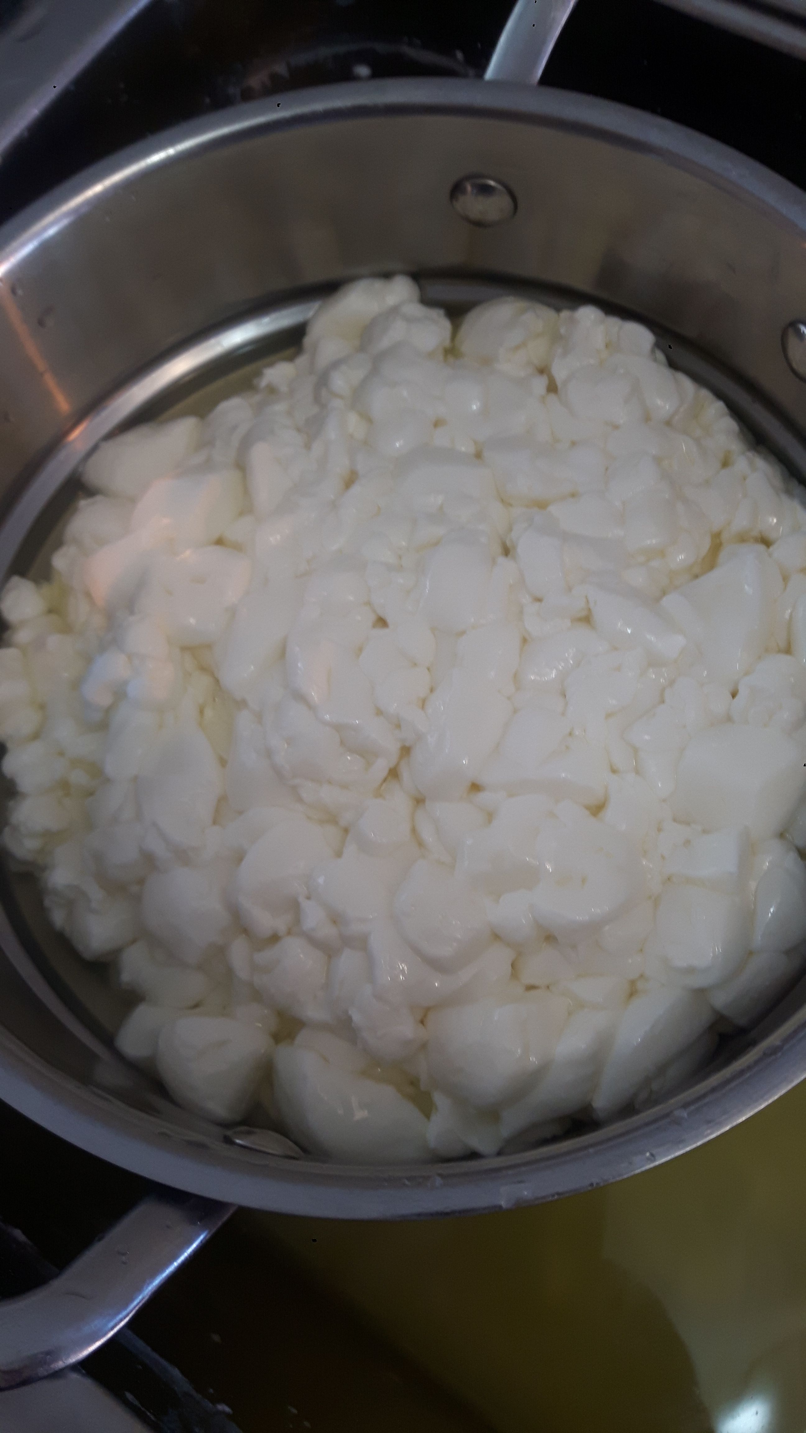 With the curd warming, you will start to knead and stretch the mozza curd. The goal of this process to get more whey out of the cheese, while producing a meltable and stringy cheese.