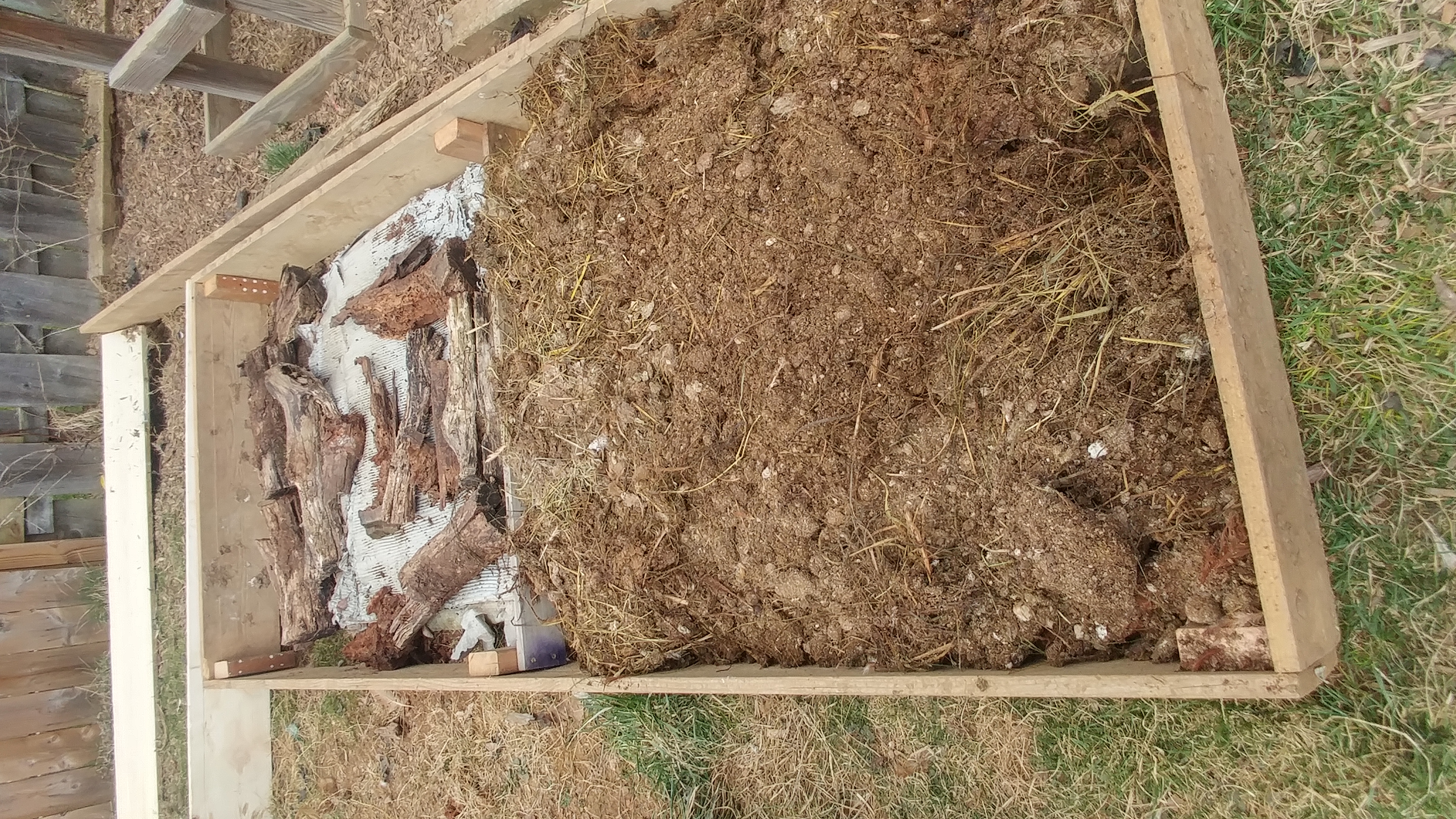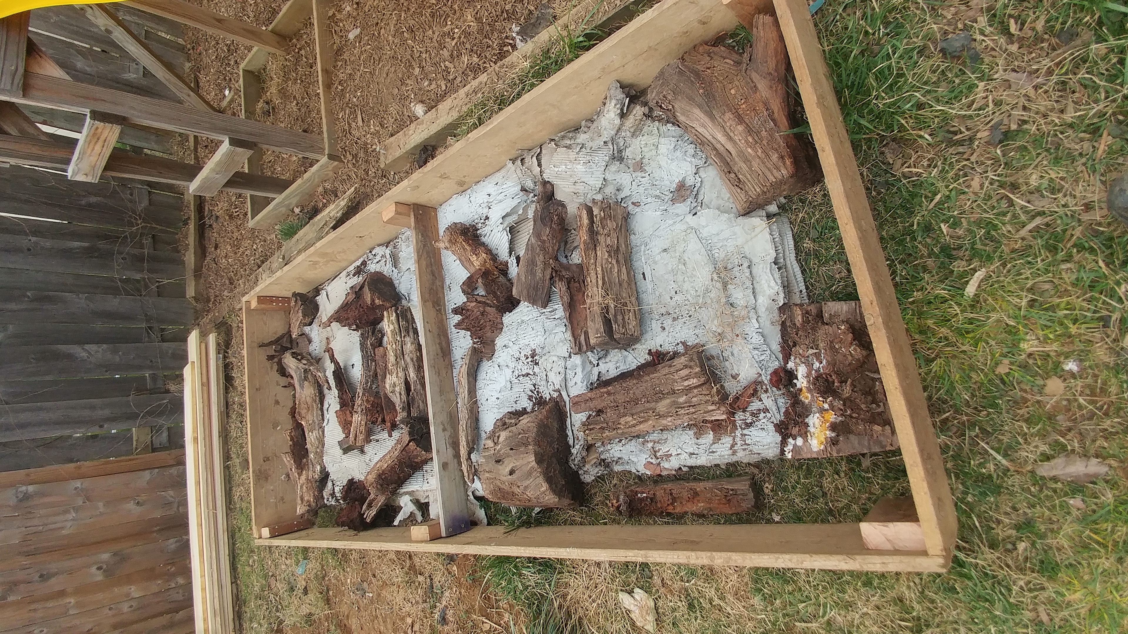 Then I layed cardboard on the bottom as weedblock and to attract the worms. I put some older wood I had laying around that was already starting to break down, on top of the cardboard. This is to help with moisture retension and adding carbon.