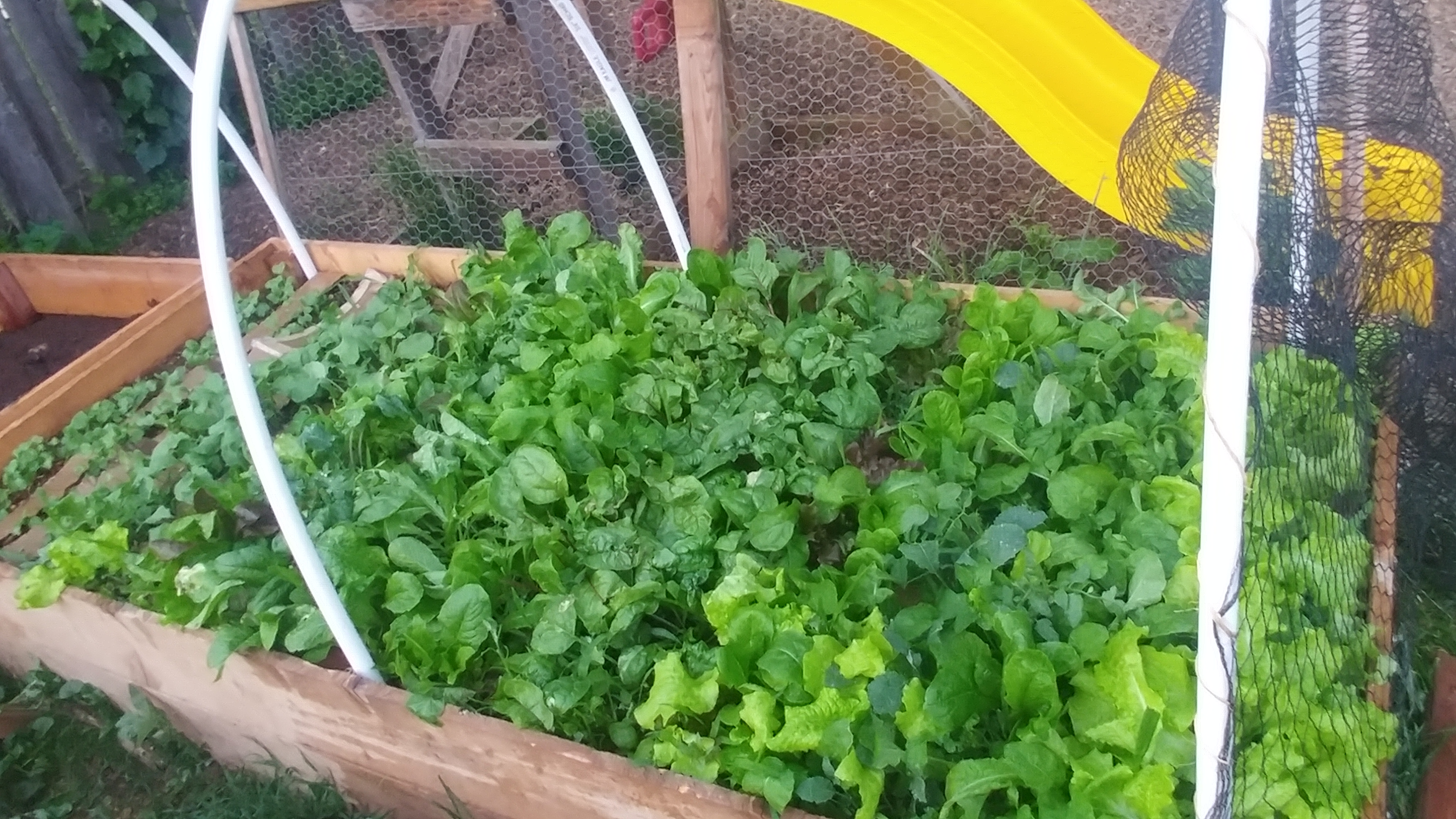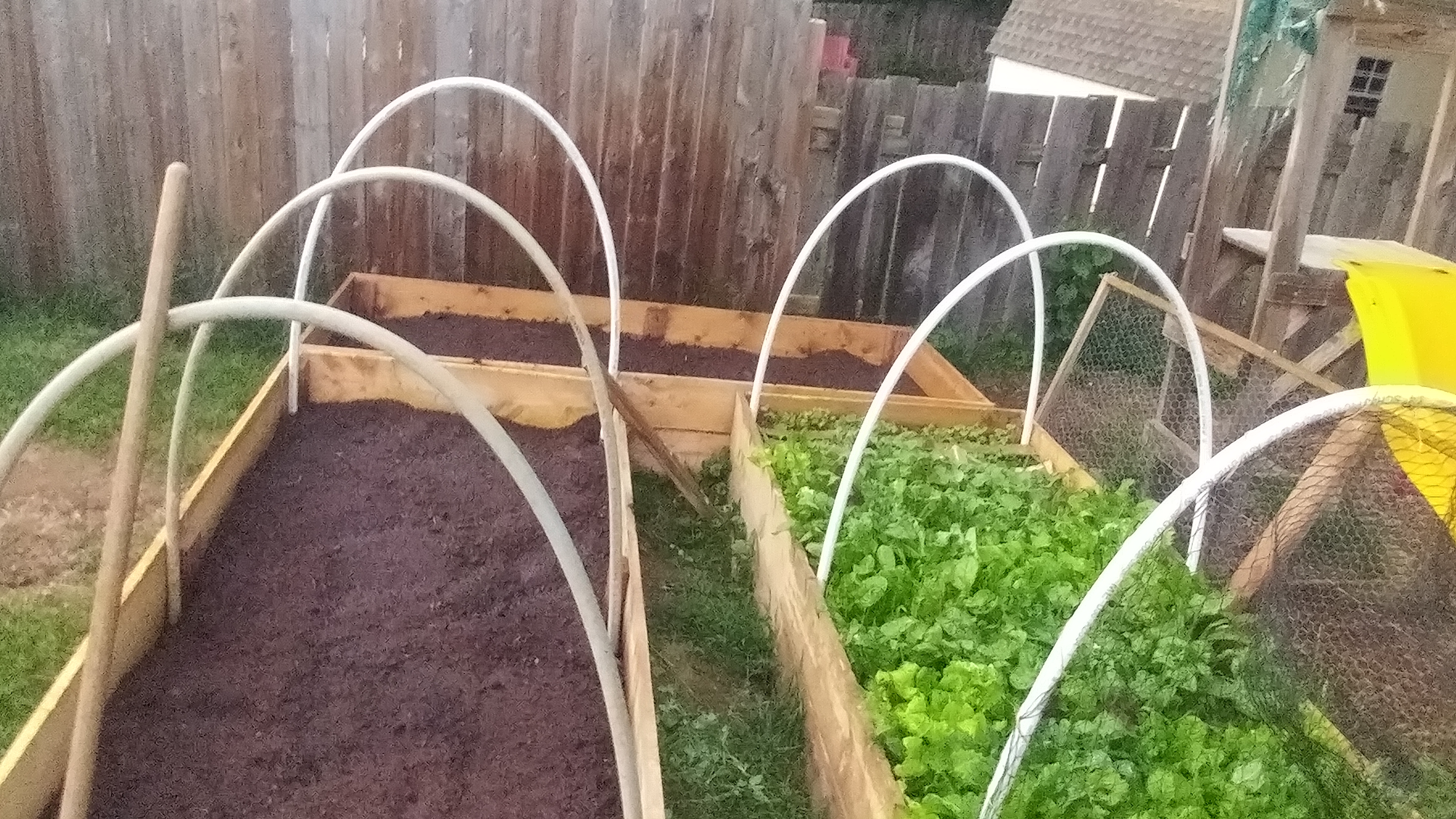 The next two are ready to go. I put hoops and poultry netting over them to keep out chickens and other critters. In all, each bed costs about $30 to build. I have cut at least $100 worth of lettuce from them.