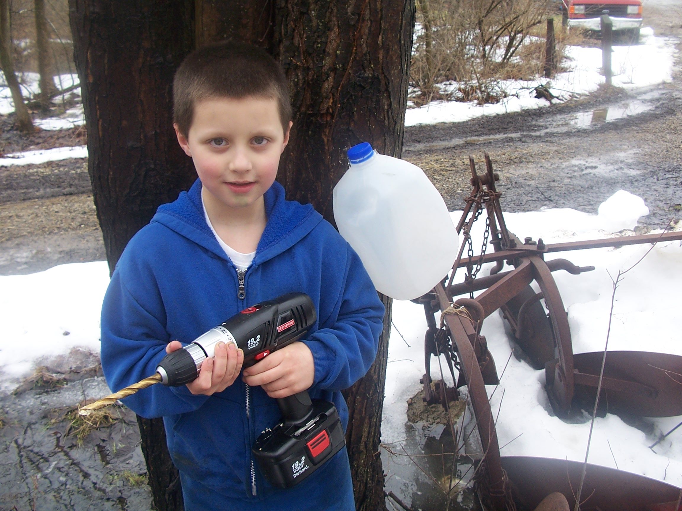 These are the simple tools of my first foray into tapping maple trees for syrup. A cordless drill with 7/16 bit, and assortment of used spiles of different types bought at auction, some hooks, a hammer, my multitool and milk jugs. Circa 2008