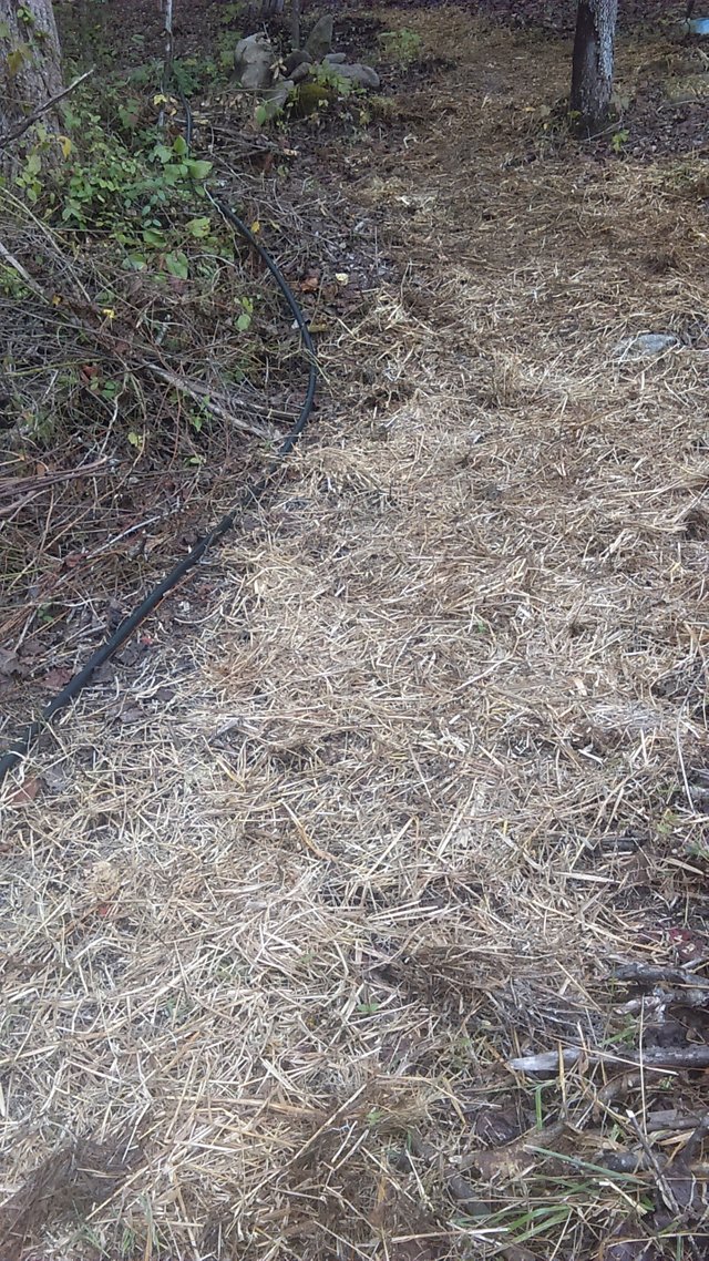 Late in the day the rain finally stopped and the sun actually came out so I went around the homestead spreading some grass seed around a bunch of bare spots and covering it with straw so that perhaps things will not become a mucky mess over the coming months. I also raked, seeded and added straw to that trail I created a while back which is the one that I want to use in the winter because it is the least treacherous of the trails that lead into the woods here. Since I had previously only cultivated the trailhead itself I used a hard rake to clear about two hundred feet of it of sticks, leaves and rocks before applying grass seed to it as well. Hopefully there will be some warm days ahead because after all this rain it won't take much to get the grass growing everywhere that I have spread it recently.