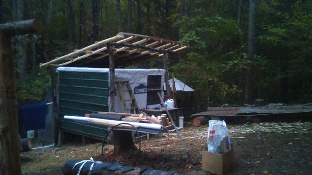 Well today once again started off rainy and chilly but I was quite cozy in my new shelter with the dogs. Admittedly the place is much more comfortable than I am accustomed to (even though the interior is unfinished) and the last few mornings I have just wanted to sleep in and not stir from beneath the blankets. Given that it has been raining and chilly I am surprised that I have not just taken a day to sleep late and get rested up for the next phase of things here which I need to get started on soon because the days are passing rapidly and I have to finish the super structure (the pitched roof that will cover the shelter) before the first snow.