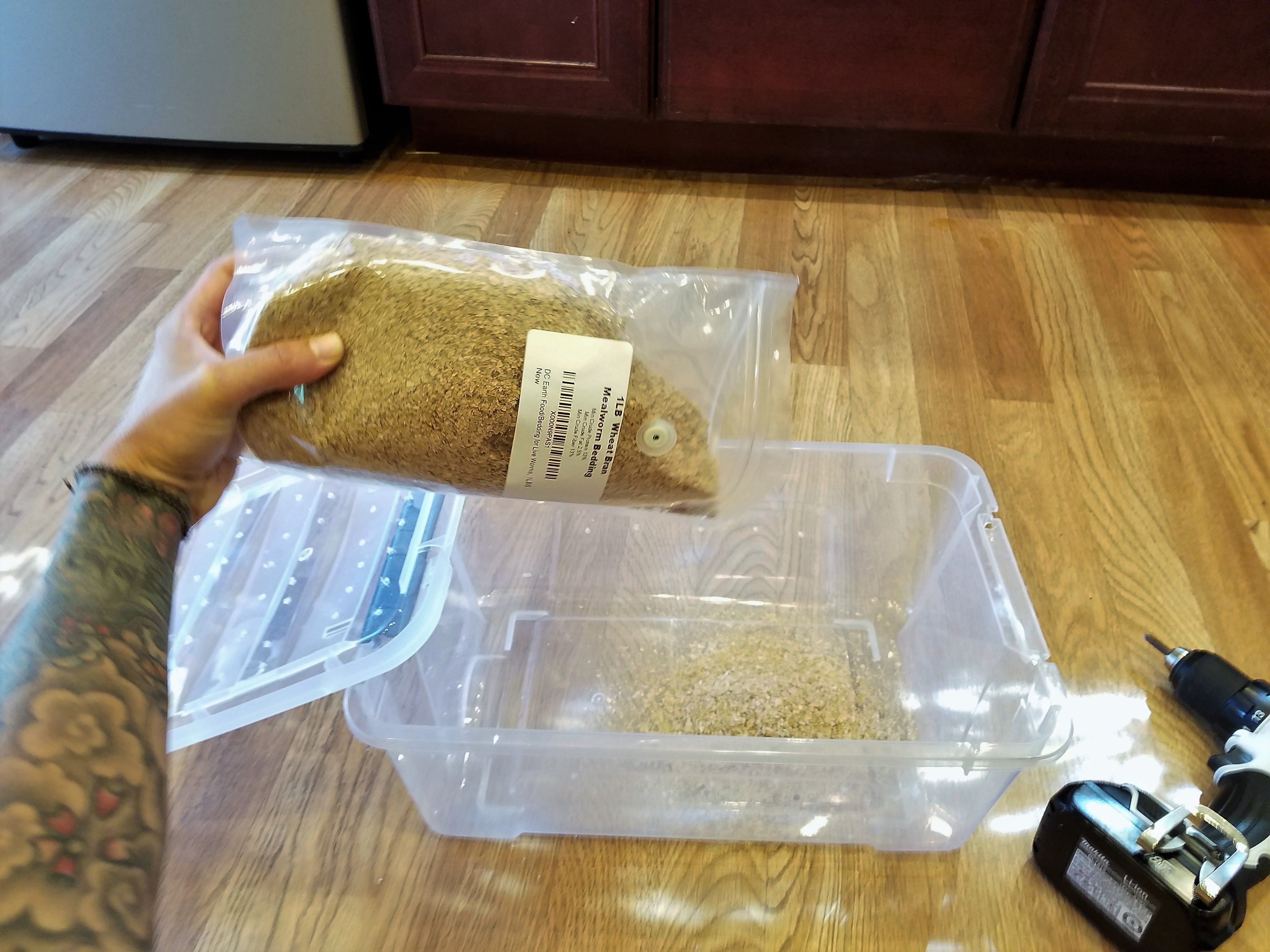 Then I poured in wheat bran up about 2 1/2 inches in the container. I poured a few cups of chicken feed on top of that and mixed it in. I had read 2 to 3 inches of dry feed for them to live in and eat.