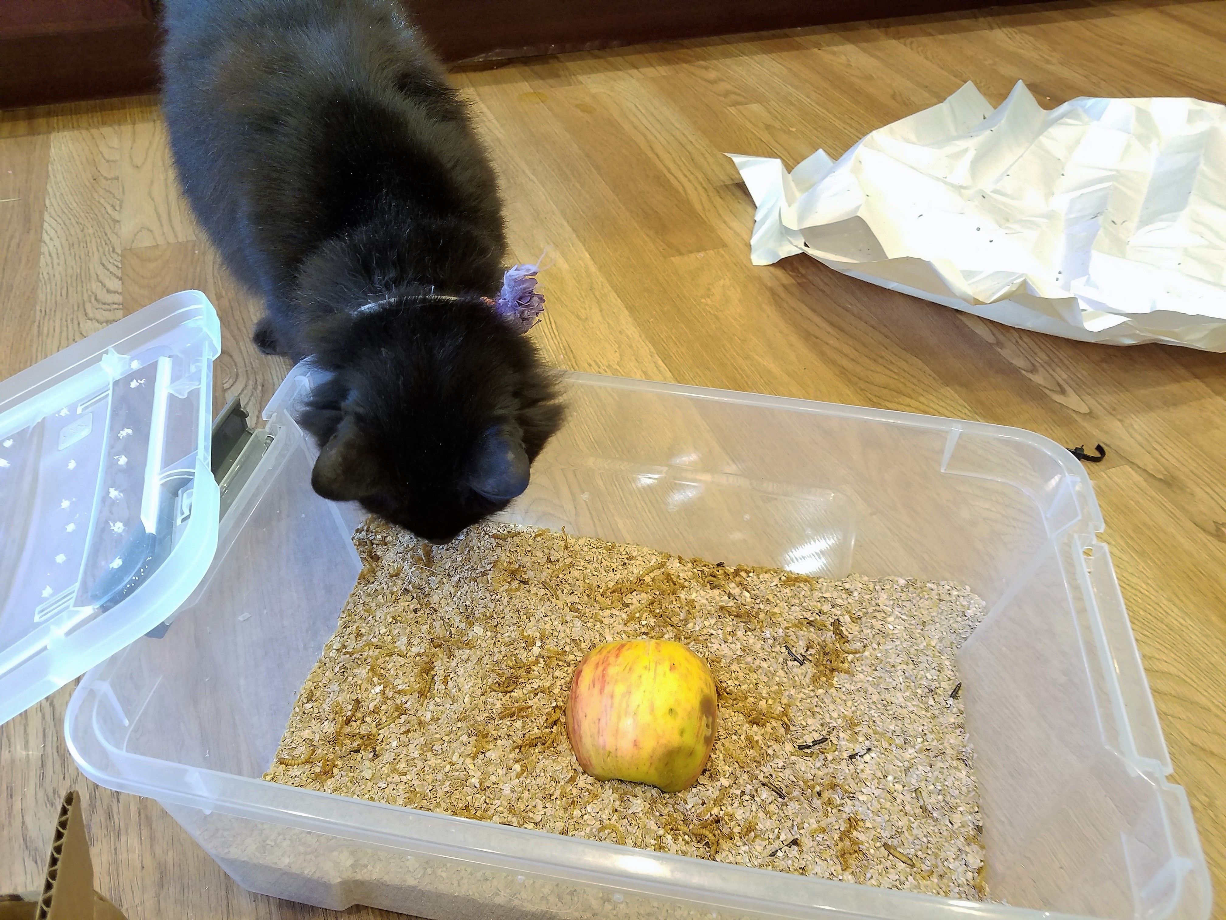 Thanks for sharing your method for growing mealworms! I hope you'll continue to keep us updated as they grow into egg laying beetles. I love the look on your cats face :D