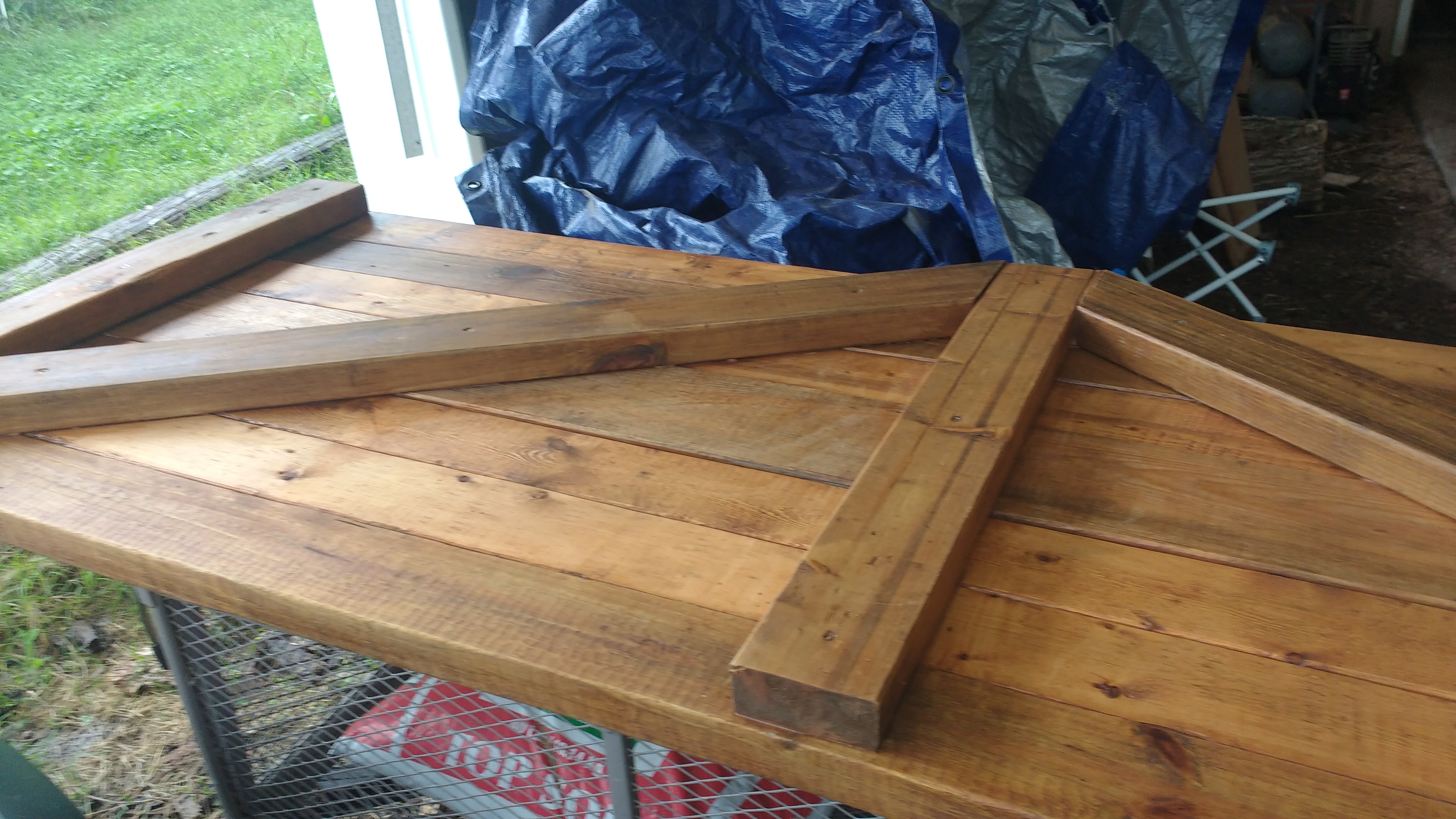 So today I have been prepping for my trip to the camp cabin to work tomorrow, while Hubby cuts firewood to keep us warm this winter! So I sanded, and stained the first door, and with Hubby's assistance, we built the front door, and stained it! So now we have two doors!!!
