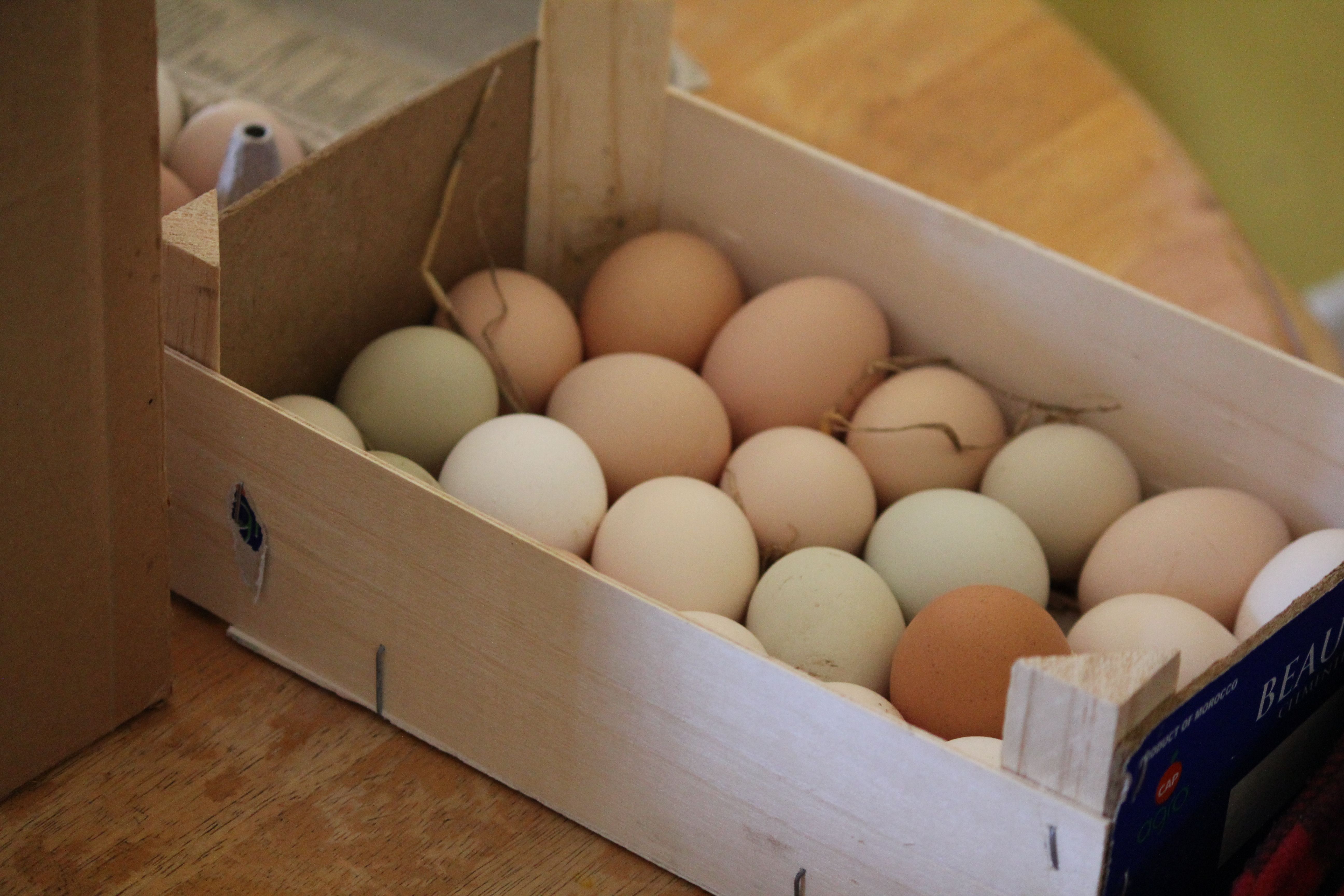 Each chicken lays a different colour <3 :) The green and pink ones come from our "Easter Egger" chickens <3