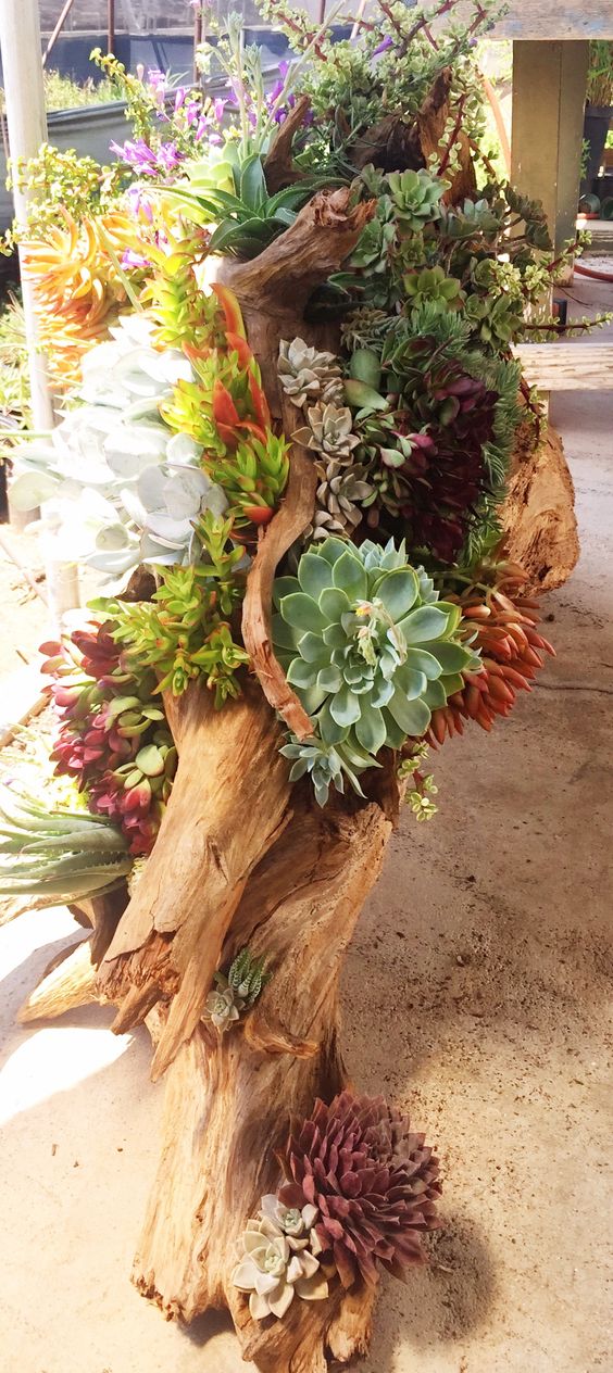 Wonderful succulents that are bedded into a 500 year old driftwood