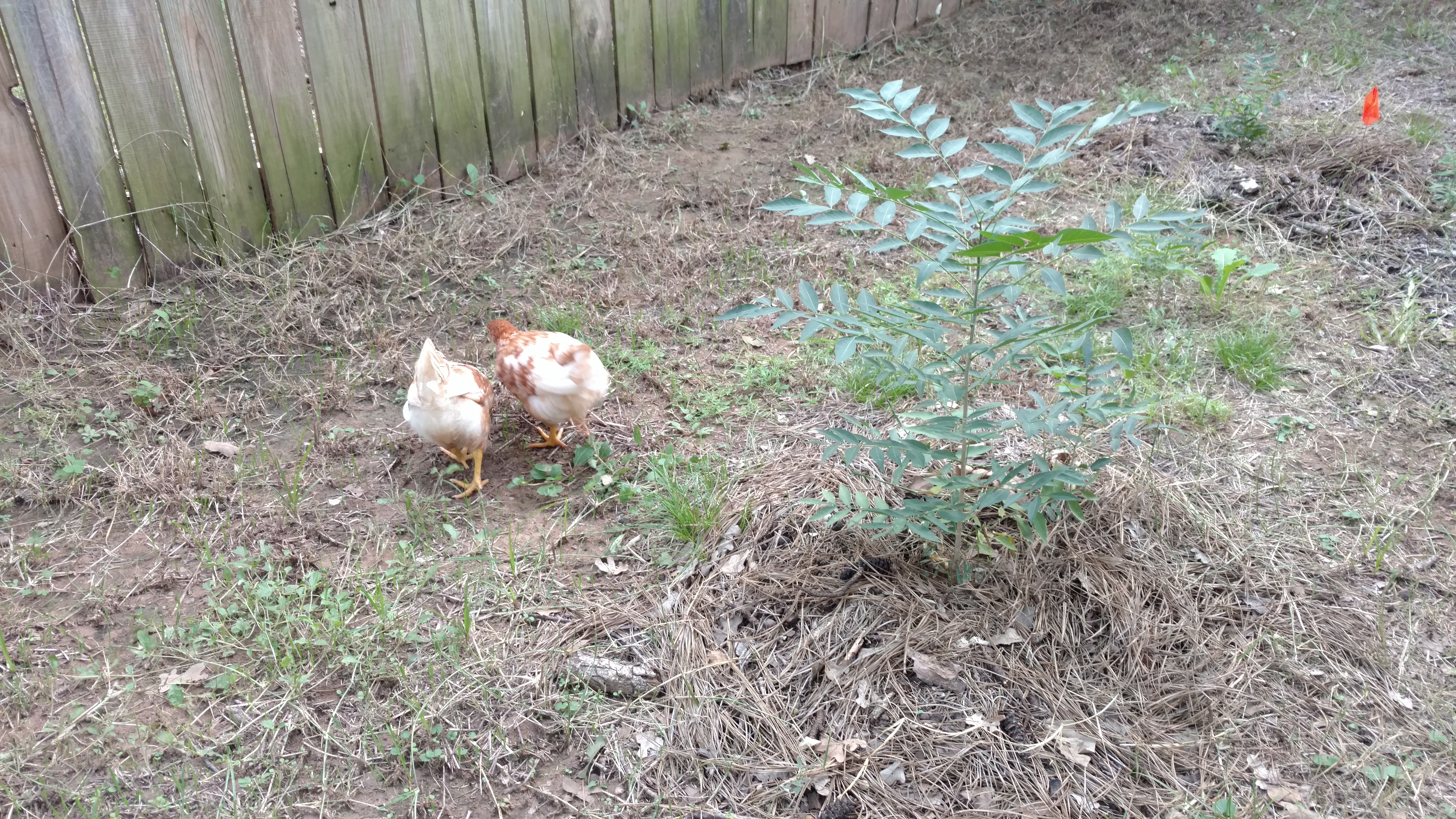 Chicks foraging by a pecan sapling in the south project.