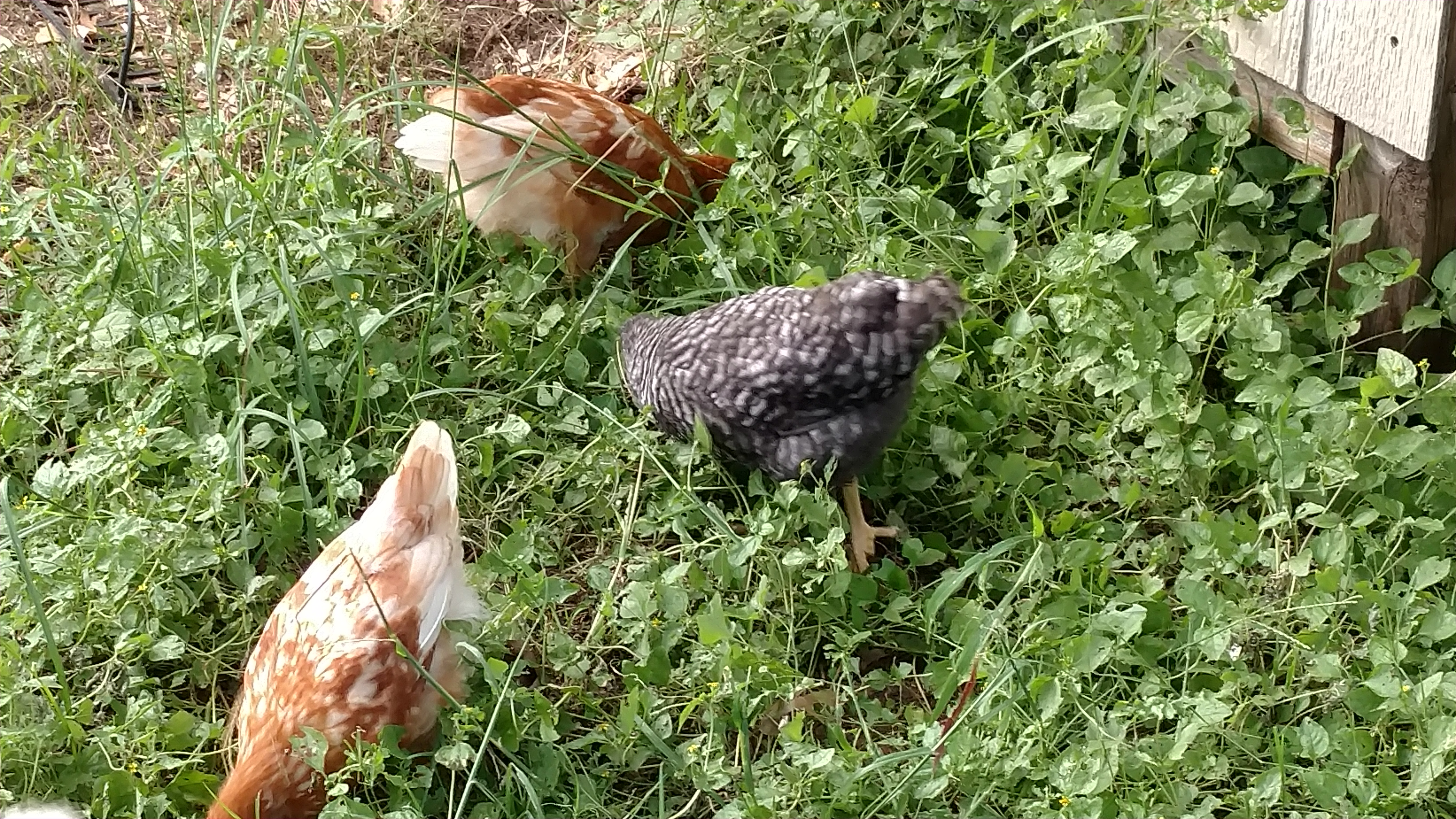 Chicks foraging in the unmowed horseherb patch.