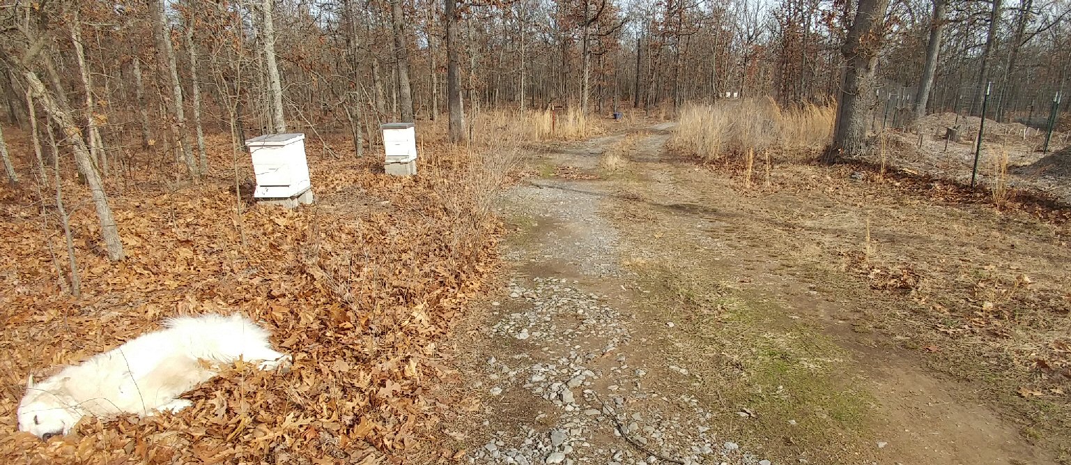 Bees tend to take off across the open area of the pathway being guarded. Likewise, place some hives at other most likely approaches to your home. If you keep gates locked when not expecting guests and have obstructions that funnel people to the path by the hives, intruders are likely to have to walk through bees. You can work this into a permaculture plan with thorny blackberry patches or something like that. Most potential intruders don’t realize walking through honey bees is not a problem, if you don’t swat at them and have on something to prevent them from getting tangled in your hair. This provides a layer of security in the daytime when bees are active, above 50°F, and the dogs may be napping.