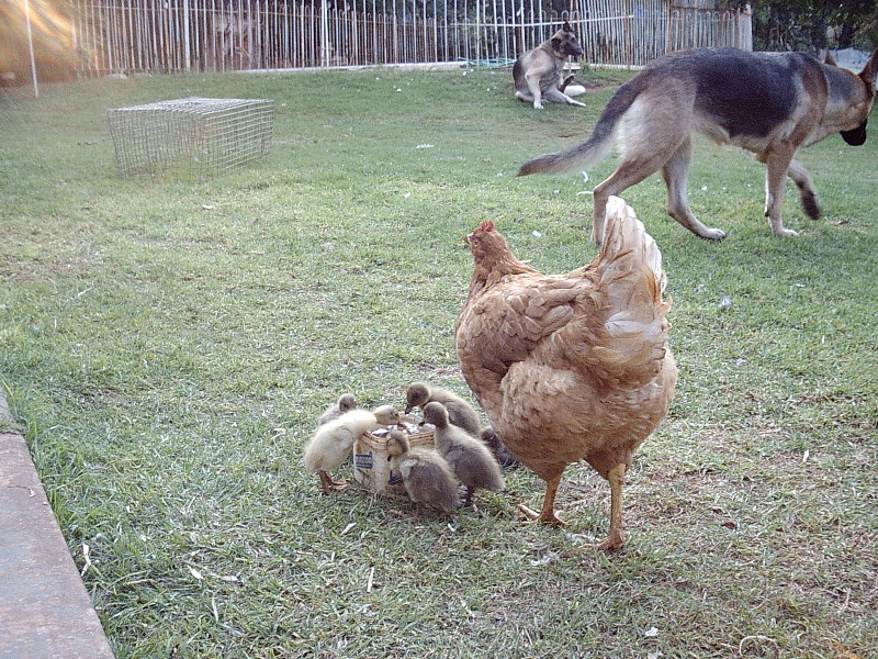 A mother hen teaches her adopted ducklings to eat properly around the table