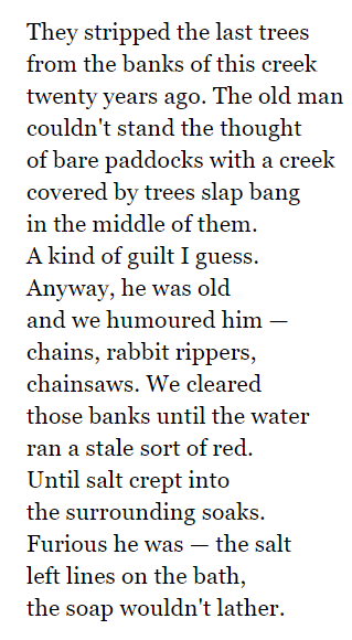 This lack of foresight and blindness is summed up beautifully by John Kinsella's poem 'Why they Stripped the Last Trees from The Banks of the Creek':