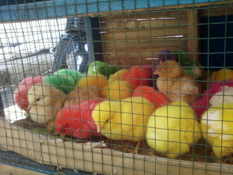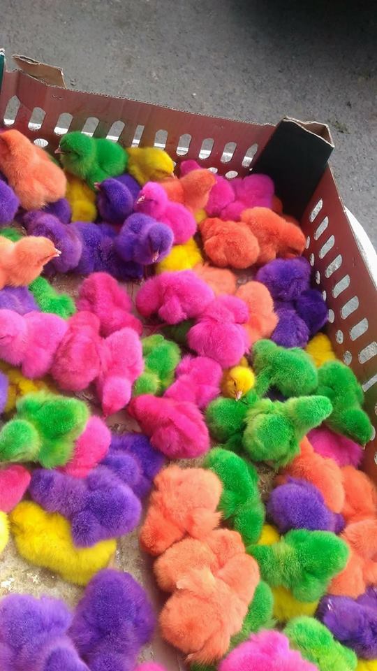 Our first chickens were these rainbow dyed ones. Then I saw the atrocious way in which they are dyed and vowed to never support that practice again. Ours ended up being Easter eggers. We still have them.