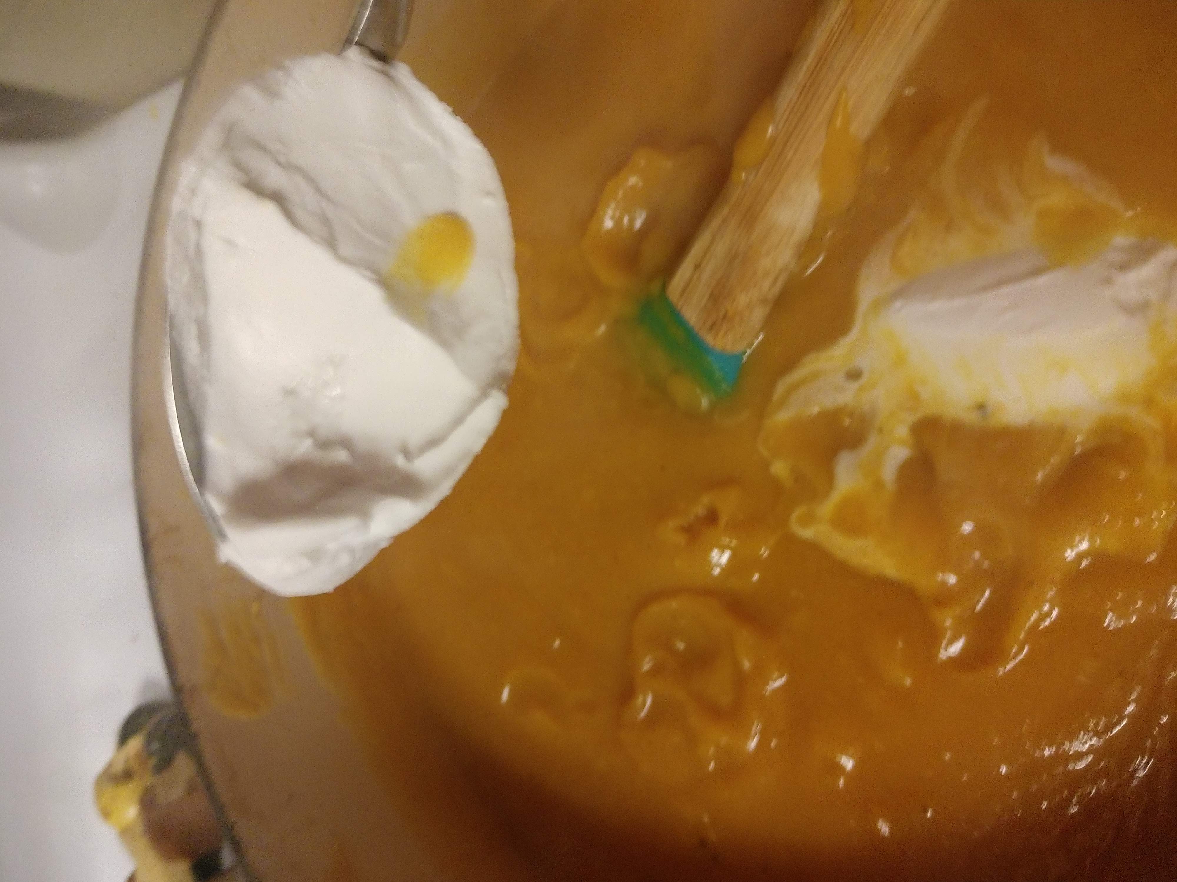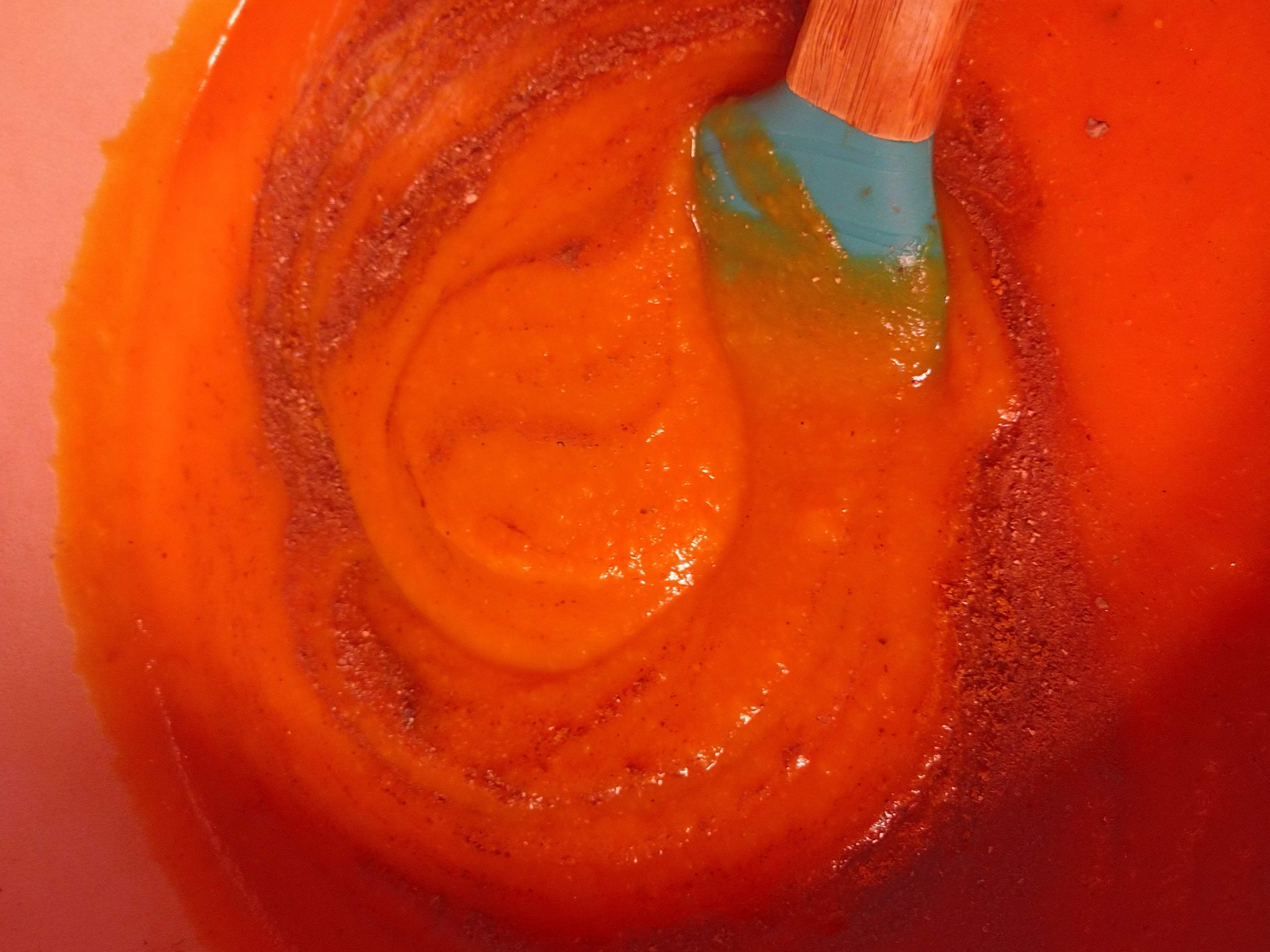 Now pour into a cast iron (enameled like mine) or stainless steel pan and add your favorite spices! You can go sweet or savory here and I went with both and I leaned in an Indian flavor direction because I felt like it (pregnancy cravings have to be obeyed). For the sweet side I used more fresh grated nutmeg, a dash of Ceylon cinnamon and have seen people use pumpkin pie spice. Then for Indian highlights I did a pinch or masala, a dash of curry powder and some cumin. A little salt and pepper and we had the perfect flavor profile... almost! Then I bring to simmer on low to medium heat. Be careful not too hot or splatters will burn you.