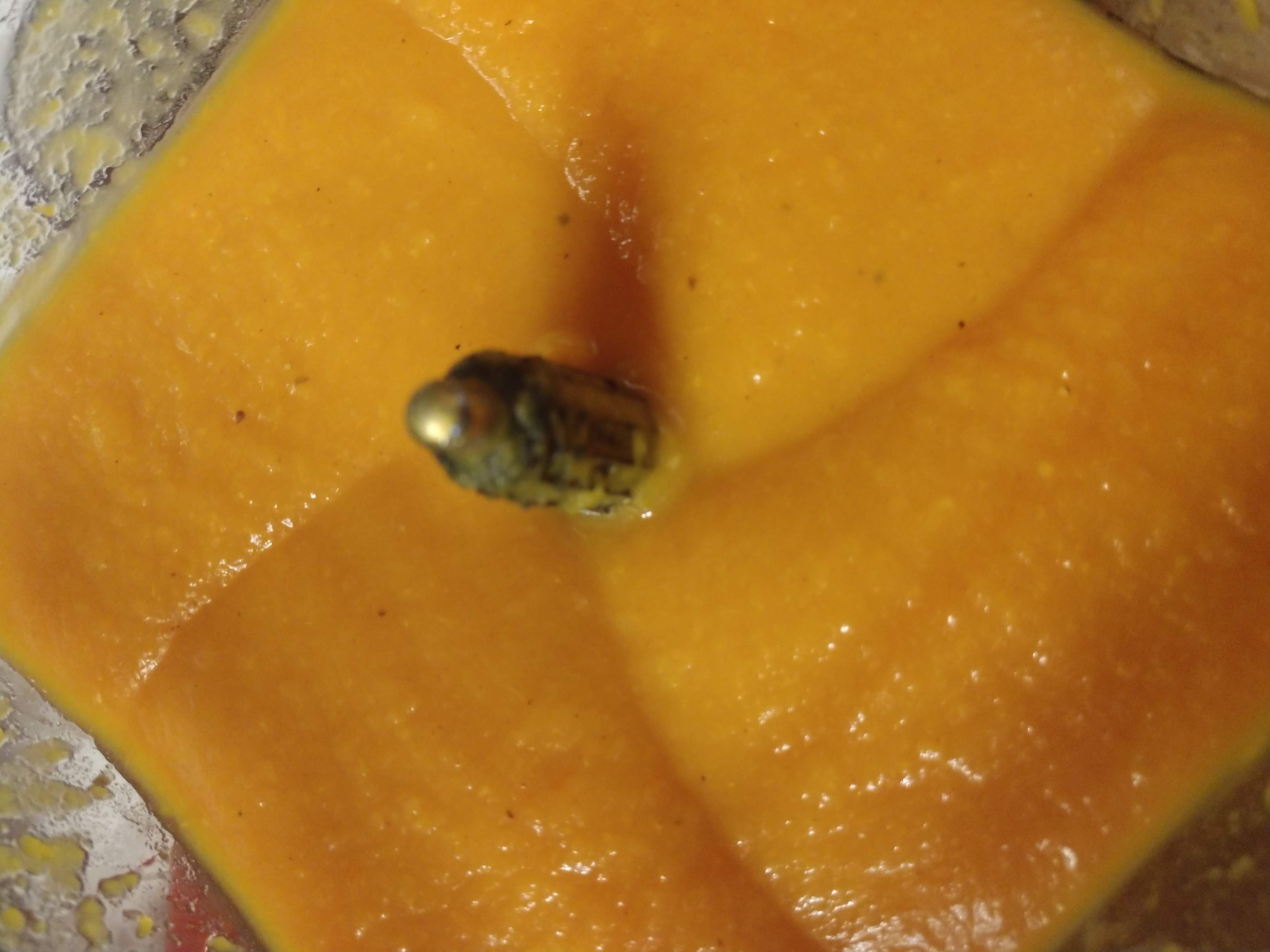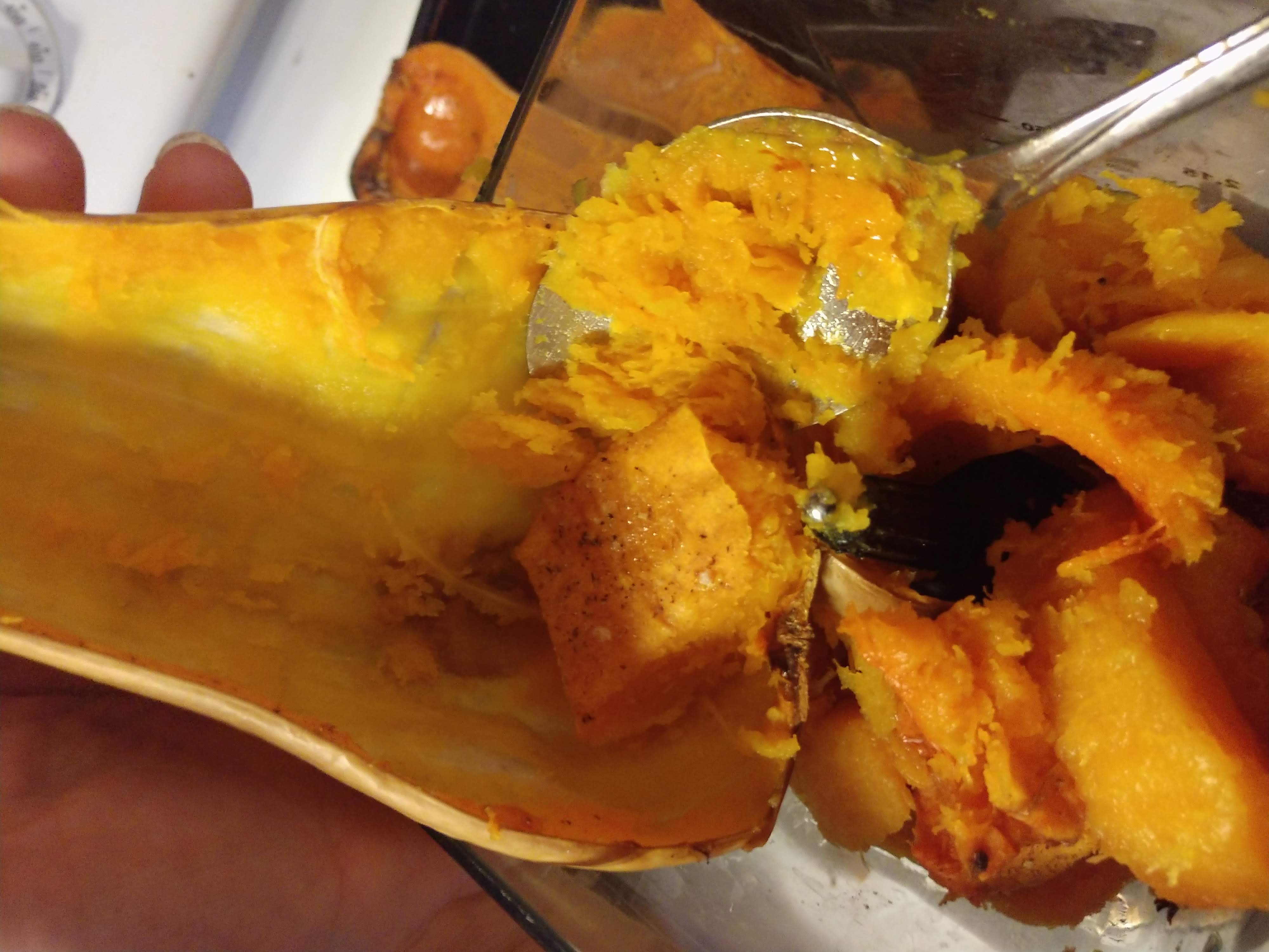 Will be fork tender and your house will smell amazing! Let cool to touch after removing from oven. Then spoon out the squash flesh from the skin to prepare to blend it smooth. You can use an immersion blender or something like my Ninja Blender.
