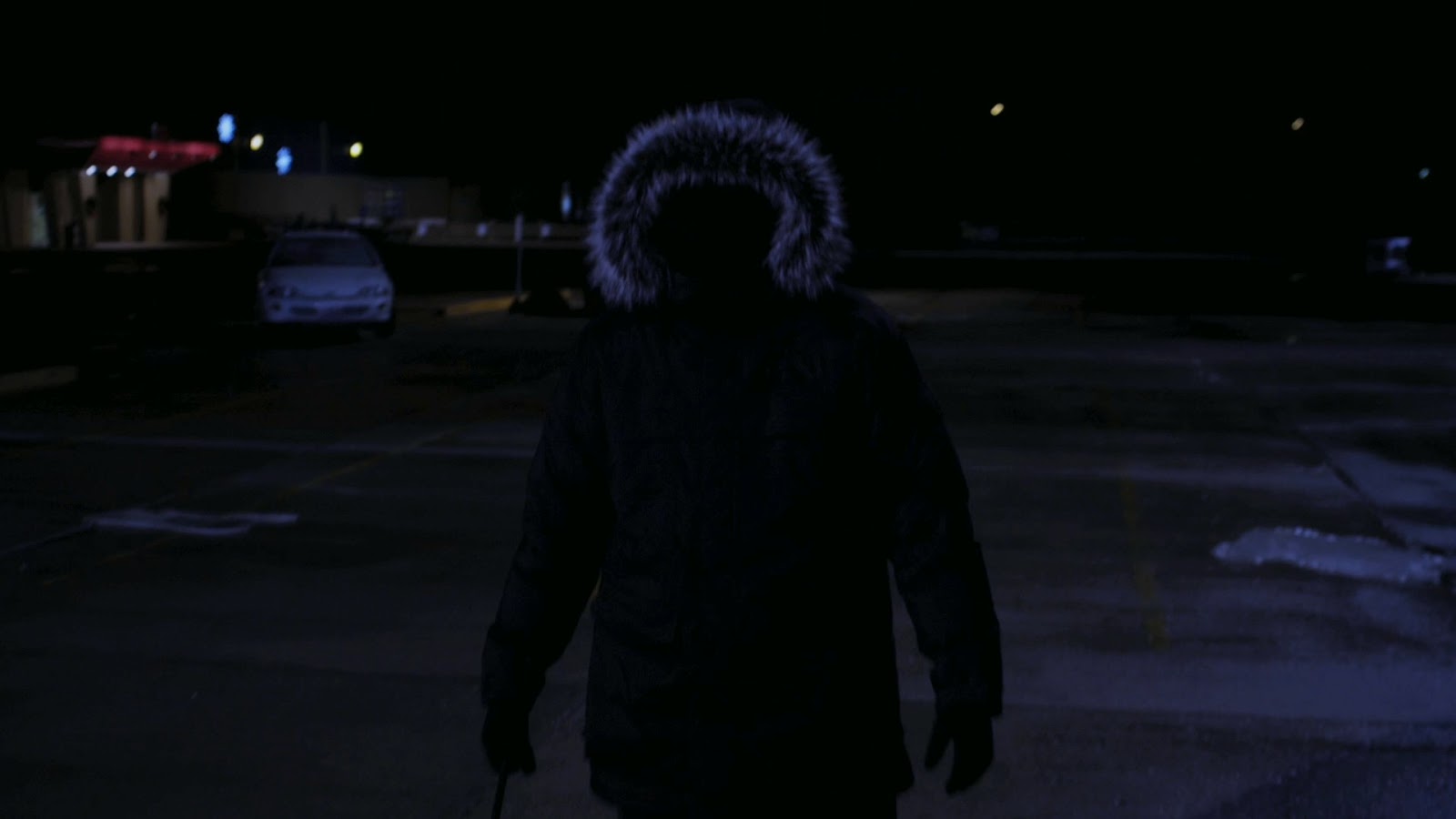 So, there's a guy in a big fur coat waiting outside the ATM booth. They attempt to make him look intimidating; but fall far short of that. The viewers mainly get to see the killer's silhouette stand in one place, hands awkwardly at his sides, and occasionally scuffle around in a really humorous way. To be fair, it's probably somewhat accurate to how you would most comfortably move in that attire; however, it has a really laughable affect that does not fit in to the terror they are trying to create.