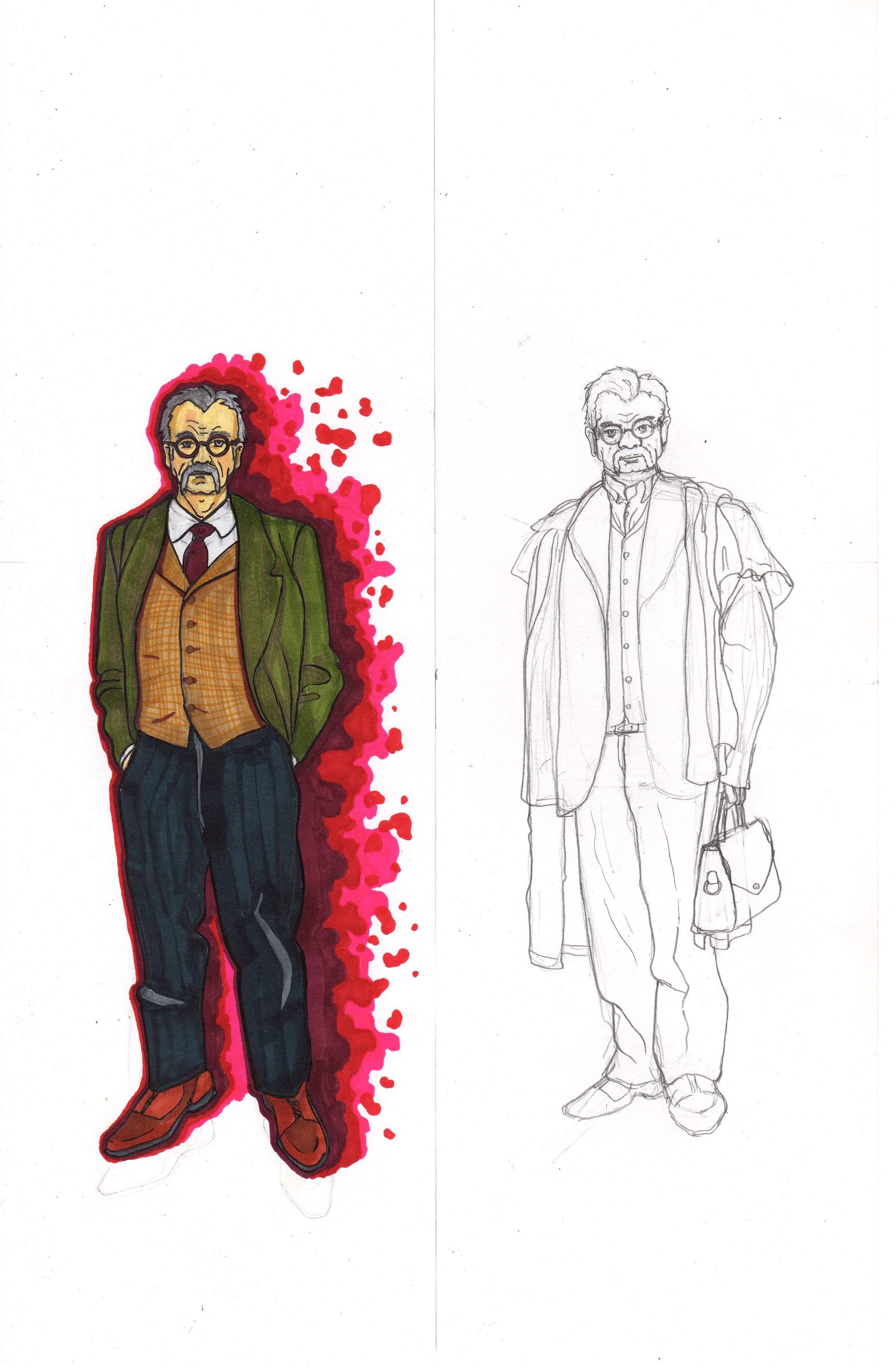 Below are the current studies for the protagonist and antagonist of the story. These are not necessarily final designs nor color choices, but they are the beginning steps. These all combine both Copic brand markers along with the much cheaper Ohuhu markers.