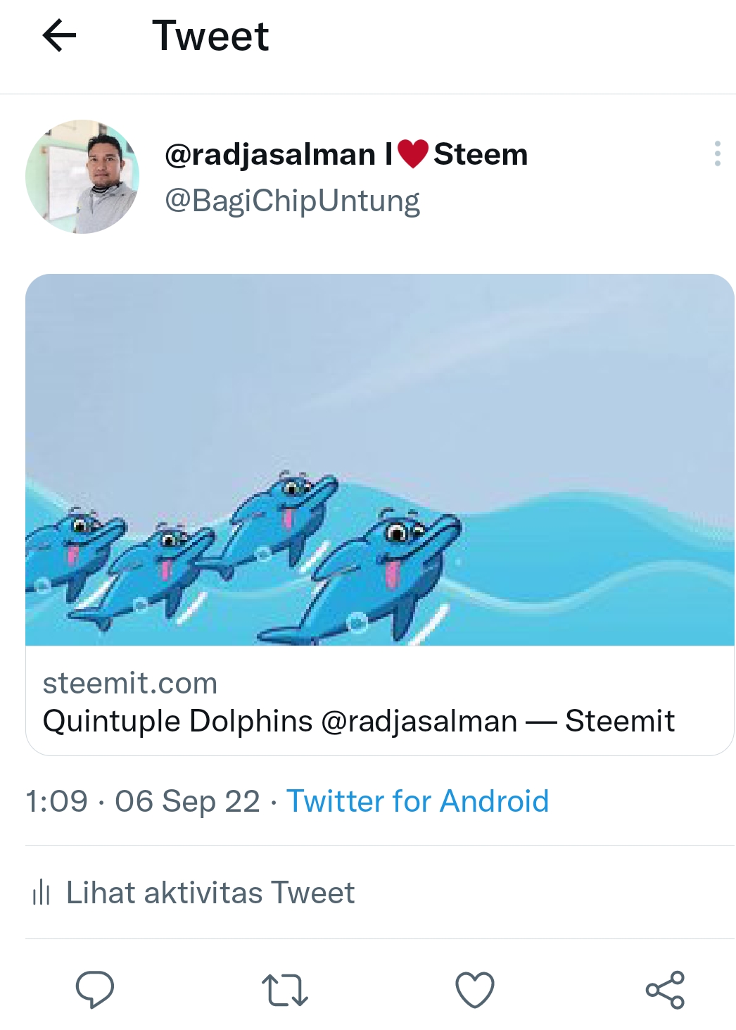 Saya mengucapkan terimakasih kepada semua yang telah membantu dan memberikan dukungan kepada saya selama ini hingga memperoleh dolphin kelima ini. Saya juga sangat berterimakasih kepada tim Steemit yang terus memberi dukungan selama ini.