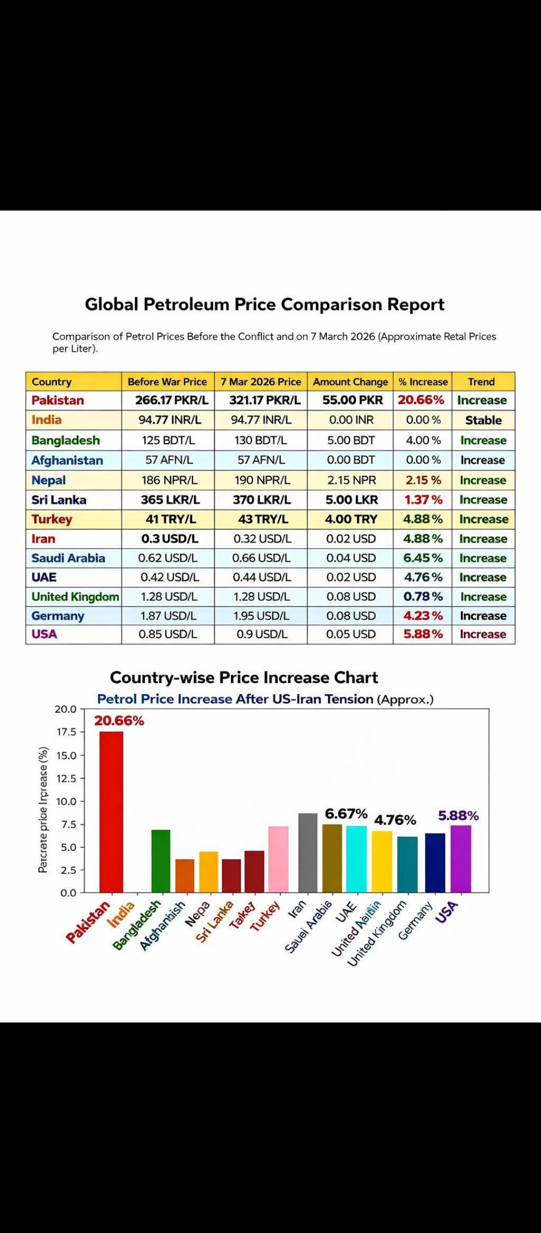 For example, petrol in Pakistan increased from about 266 PKR per liter to around 321 PKR per liter, which is a rise of nearly 20.66%.