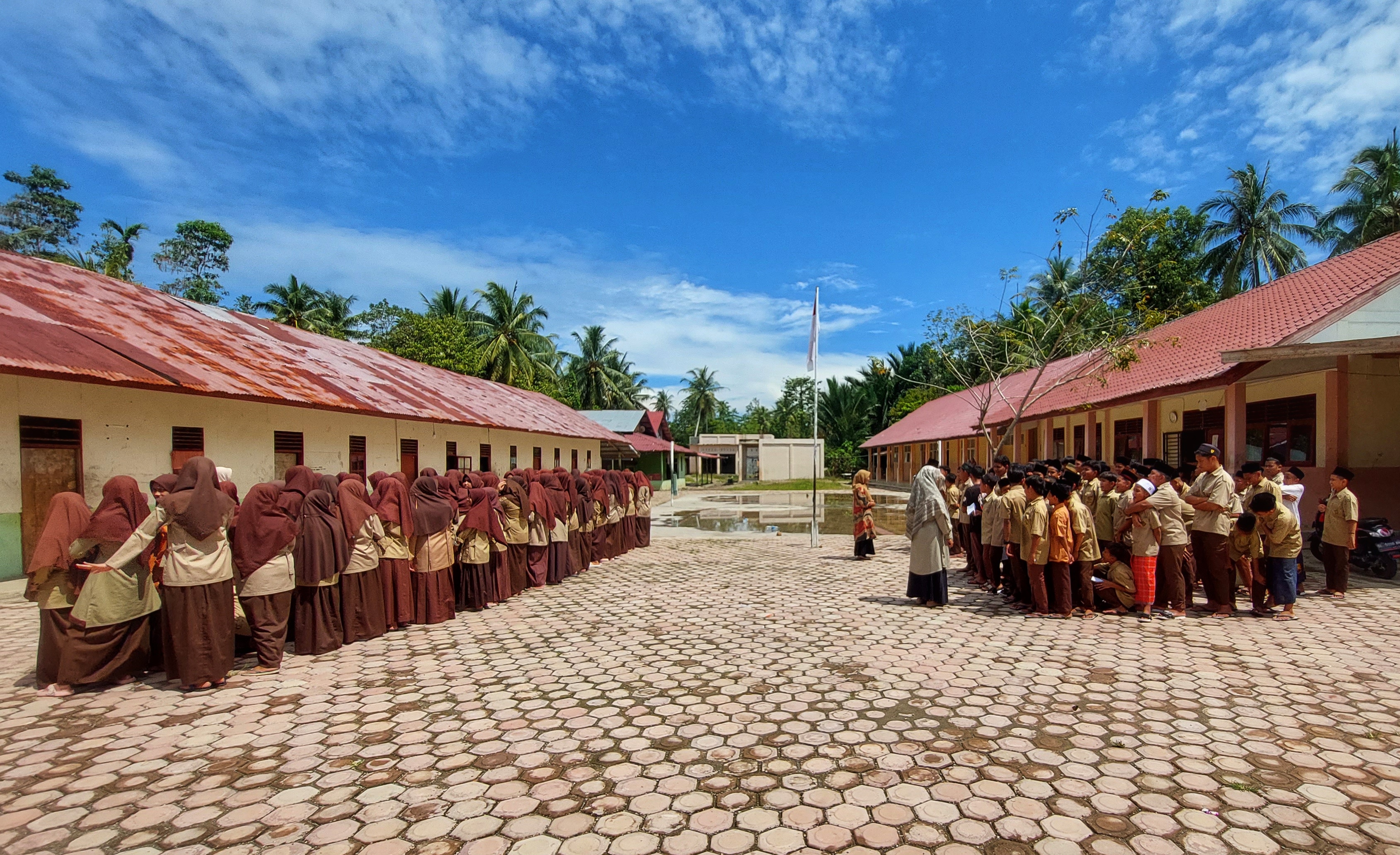Suara alarm membuat saya terbangun di pagi yang cerah ini, lalu seperti biasa saya selalu mencari smartphone untuk membuka beberapa notifikasi yang masuk pagi ini. Lalu beberapa menit kemudian saya menemui keponakan untuk mengganggunya yang lagi asik bermain di depan televisi, setelah itu saya memasuki kamar mandi untuk mandi lalu bersiap-siap pergi ke sekolah SMP Raudhatul Ulum yang terletak di Desa Tanjong Ulim.