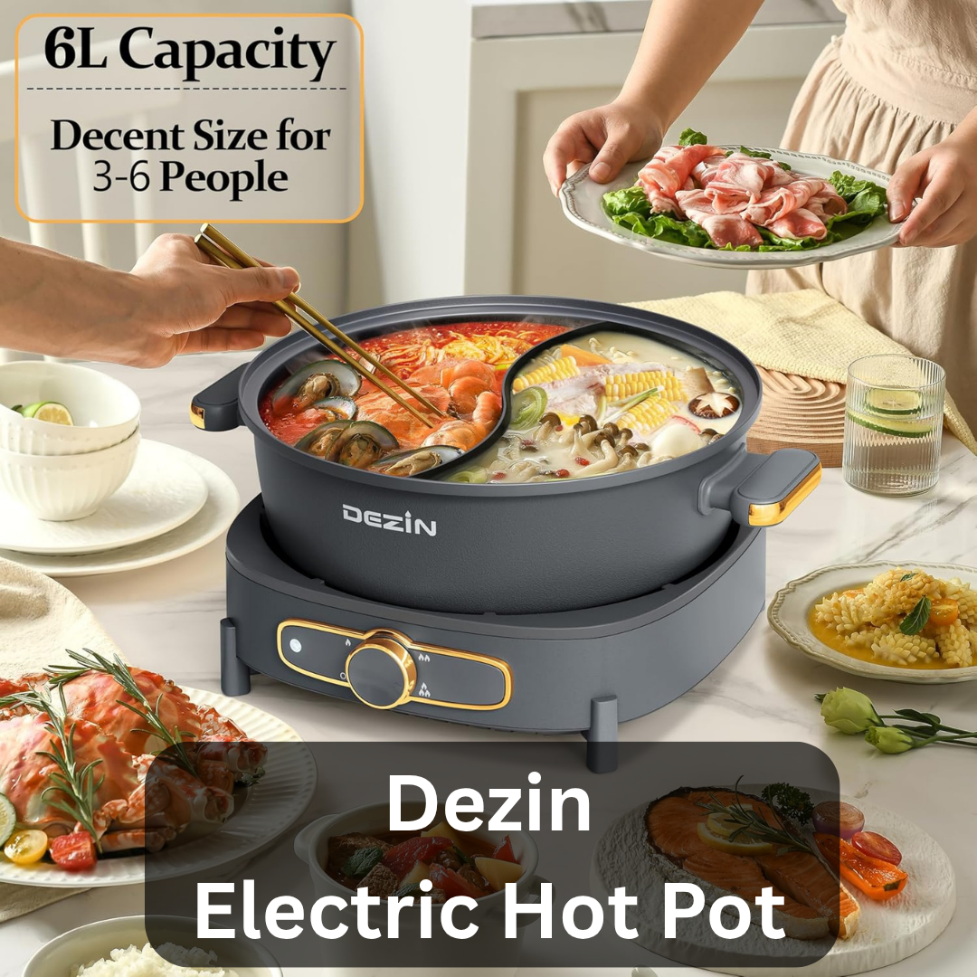 Dezin Hot Pot Electric with Divider, 6L Double-Flavor Shabu Shabu Pot, Dual Sided Removable Non-Stick Hotpot Pot Electric, 3" Depth Chinese Hot Pot with Multi-Power Control, 2 Silicone Ladles Included