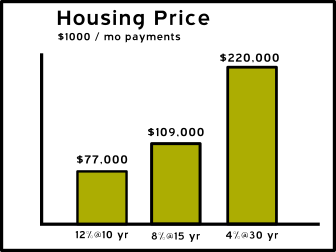 - Most of the housing price increase has been by banks lowering down payment requirements and interest while extending mortgage lengths. So, the buyer can afford more house with the same monthly payment. However, going from 4% to 3% is no where near the benefits banks got from going from 14% to 13%. And the banks do not have much wiggle room in duration. Lastly, there aren't any good non-sub-prime lenders to lend to.