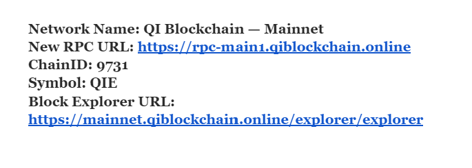 Eg : To connect with Metamask on QI network, you can go to Networks in Settings and can add following parameters to add network