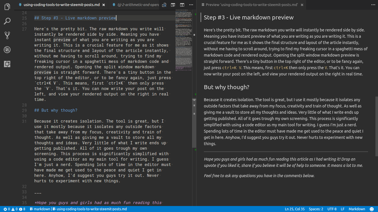 Great idea here! I have been using VS Code for quite a while now to work on JS codes. I even use it to preview markdown that I put into my GitHub repo. But for some reason, I never thought of using it for my posts on Steemit.
