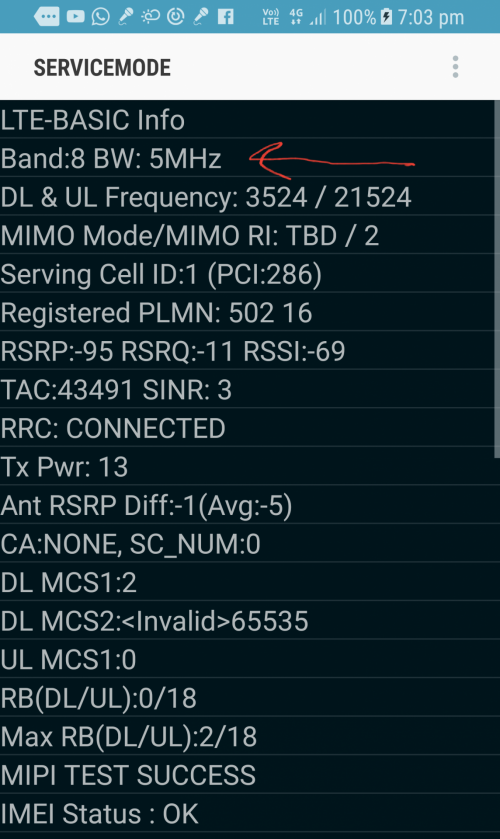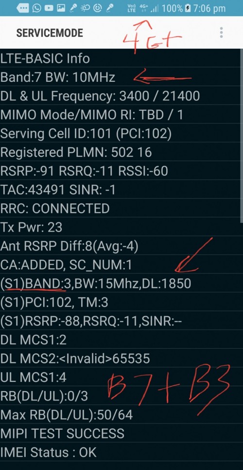 Tadaaaa! You have finally disabled Band 8 LTE, and now are connected to 4G+ network (Band 7 + Band 3), your cell info should show something like this