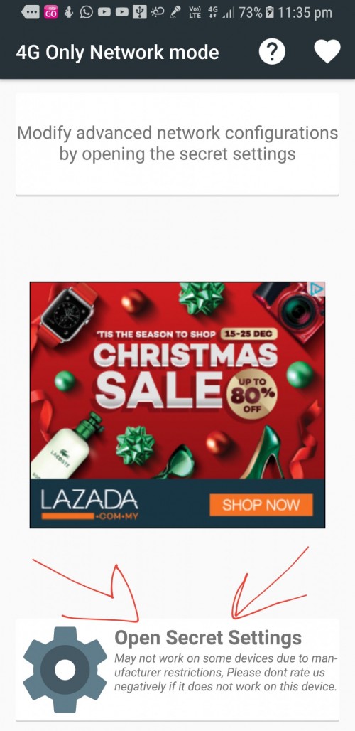 Download and install 4G Only Network Mode from the Google Play Store and launch the app, you will see this screen.