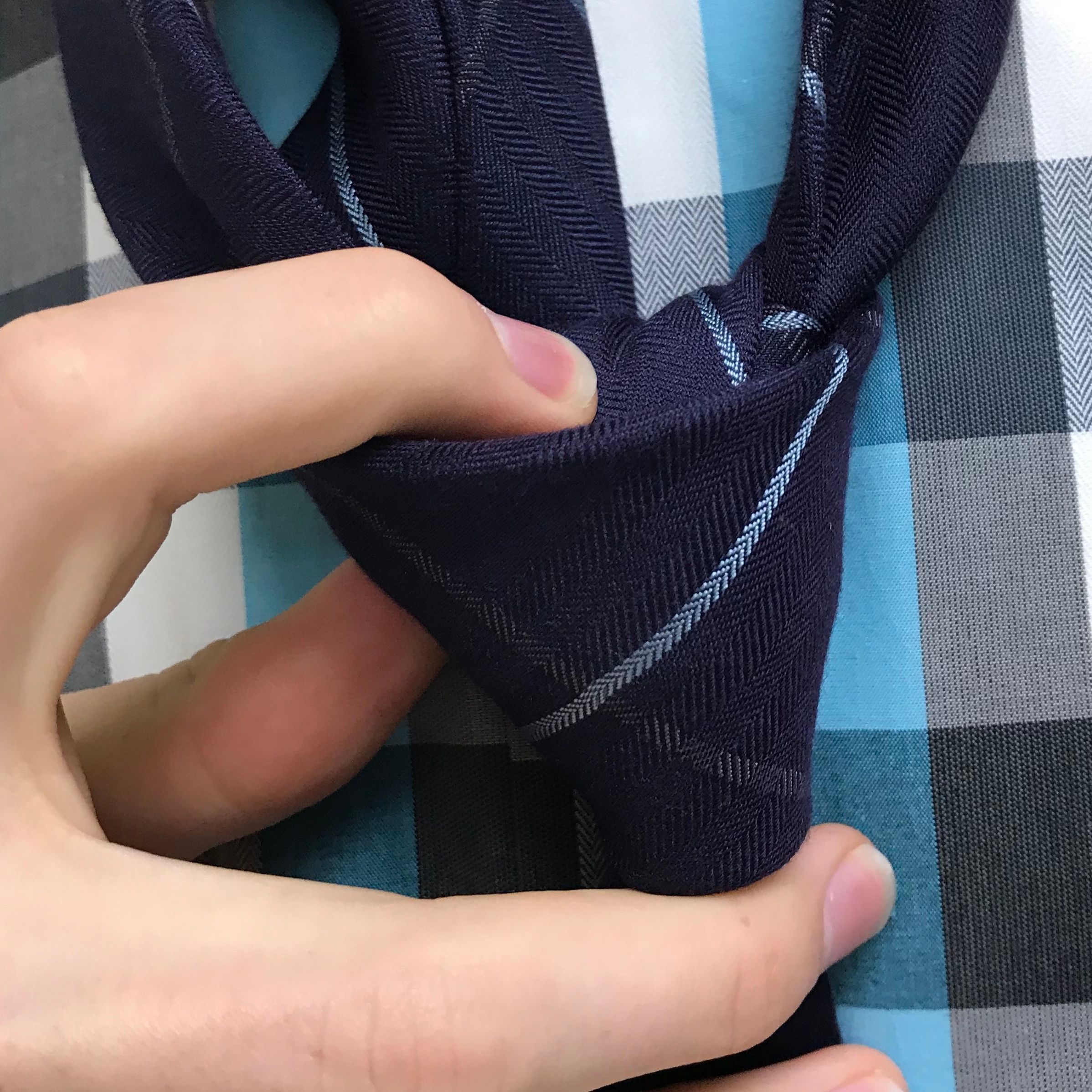 Pull to tighten. You can additionally tighten by pulling on that pocket and then pulling the long end down more. If you followed all of the steps correctly, you should have a lovely, triangle-shaped knot. This is a Windsor knot! You did it! Congratulations!