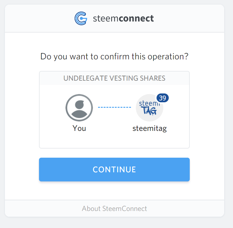 https://steemconnect.com/sign/undelegate-vesting-shares?delegatee=steemitagAfter reaching the website, make sure it is SteemConnect and proceed by clicking CONTINUE: