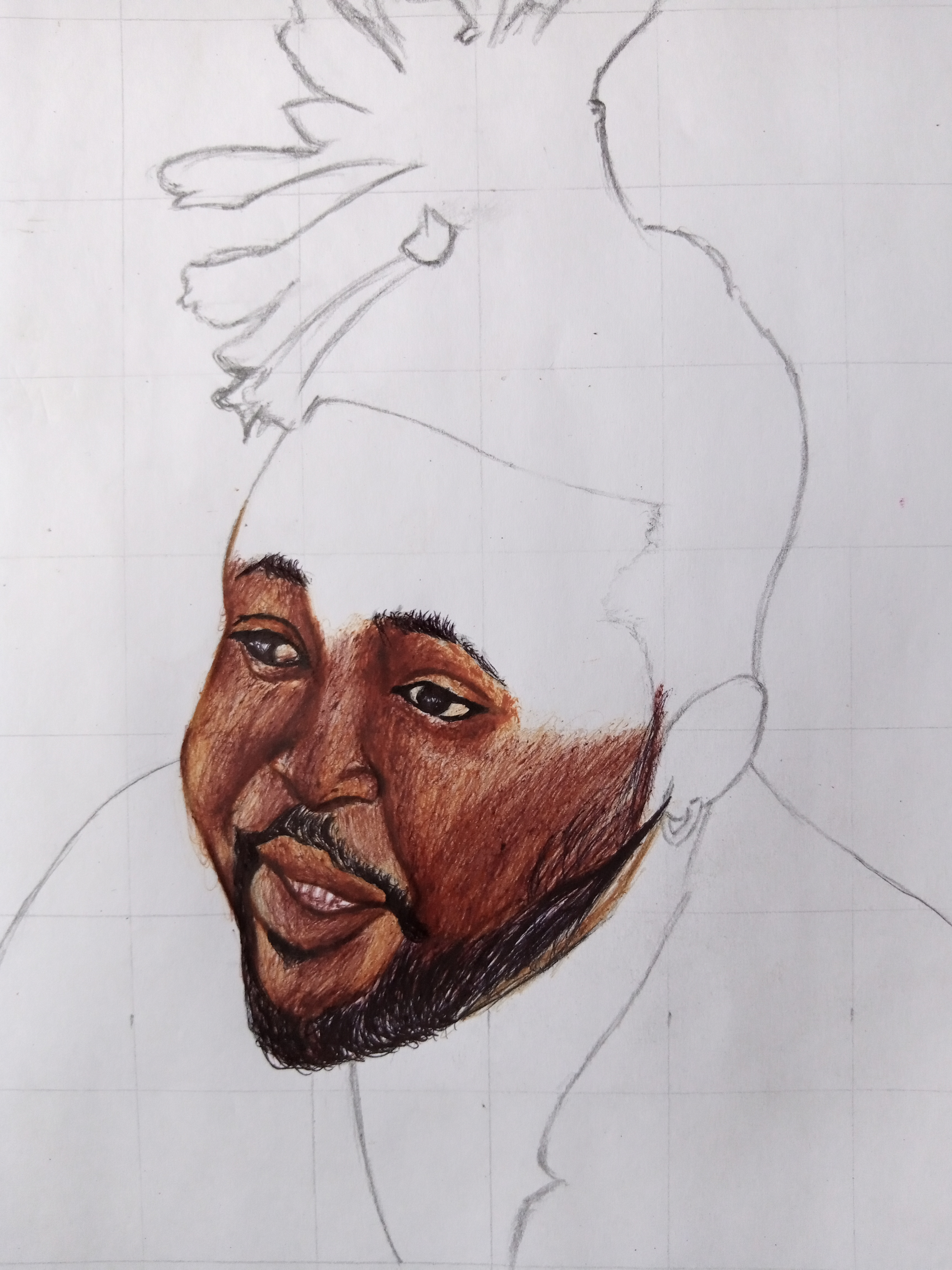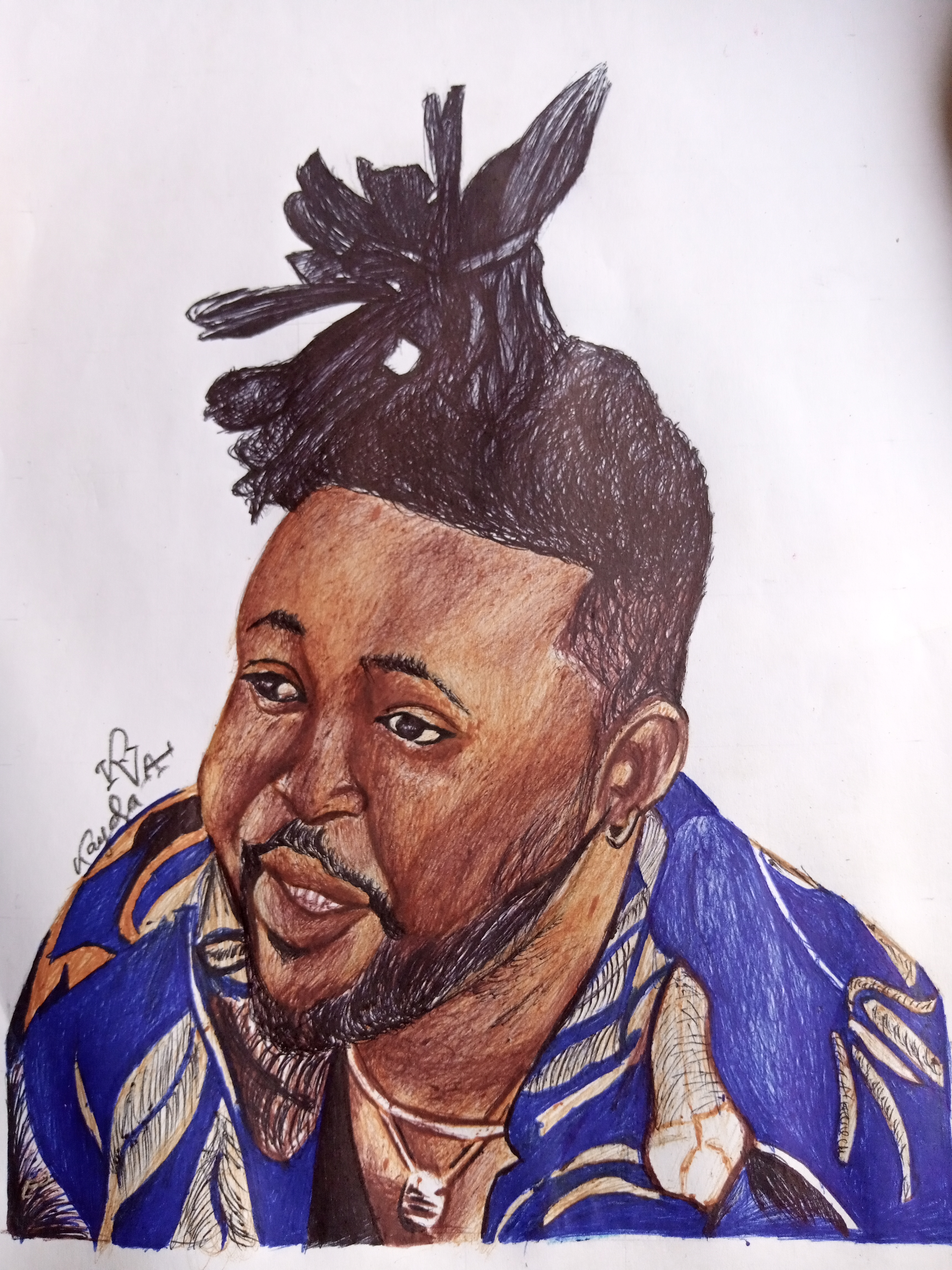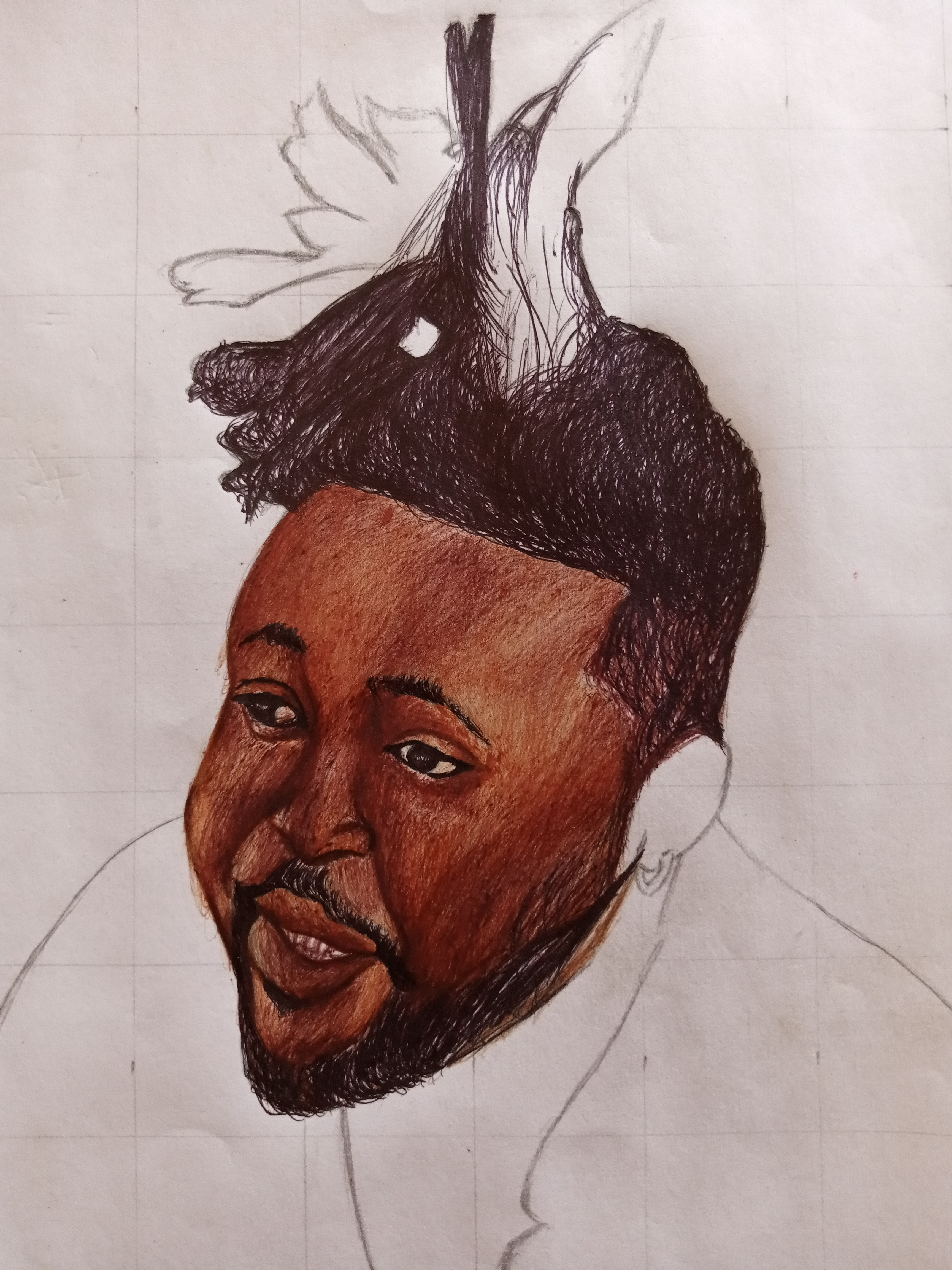 I bring to you this ballpoint drawing of a man with dreads on his head. This drawing was made with the following materials
