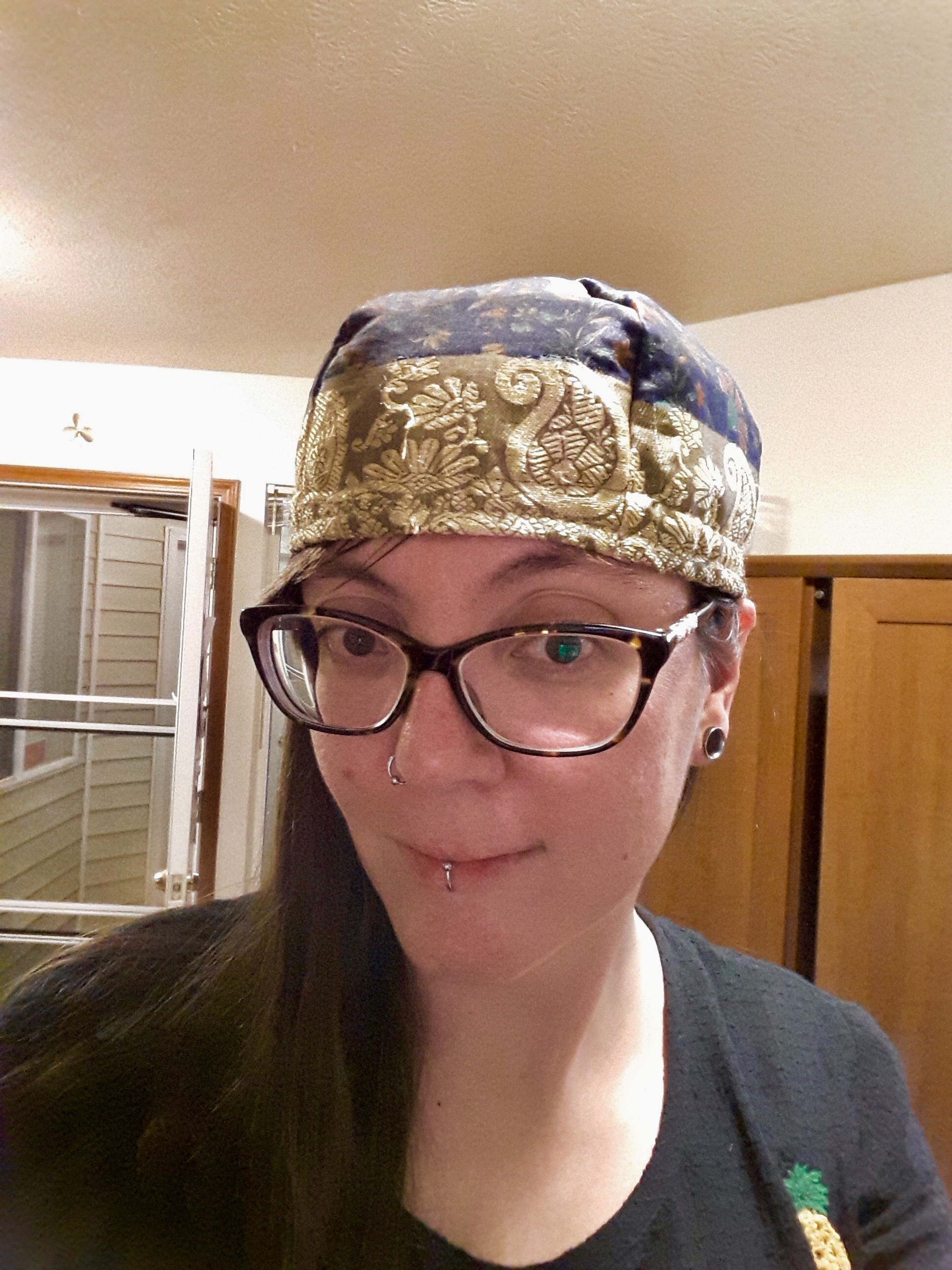I didn’t really have the time or money to go out and buy new fabric, but what I did have was one of those silk wrap skirts from India. I have never been able to tie that thing to look good on me, so I decided to turn it into my hat.