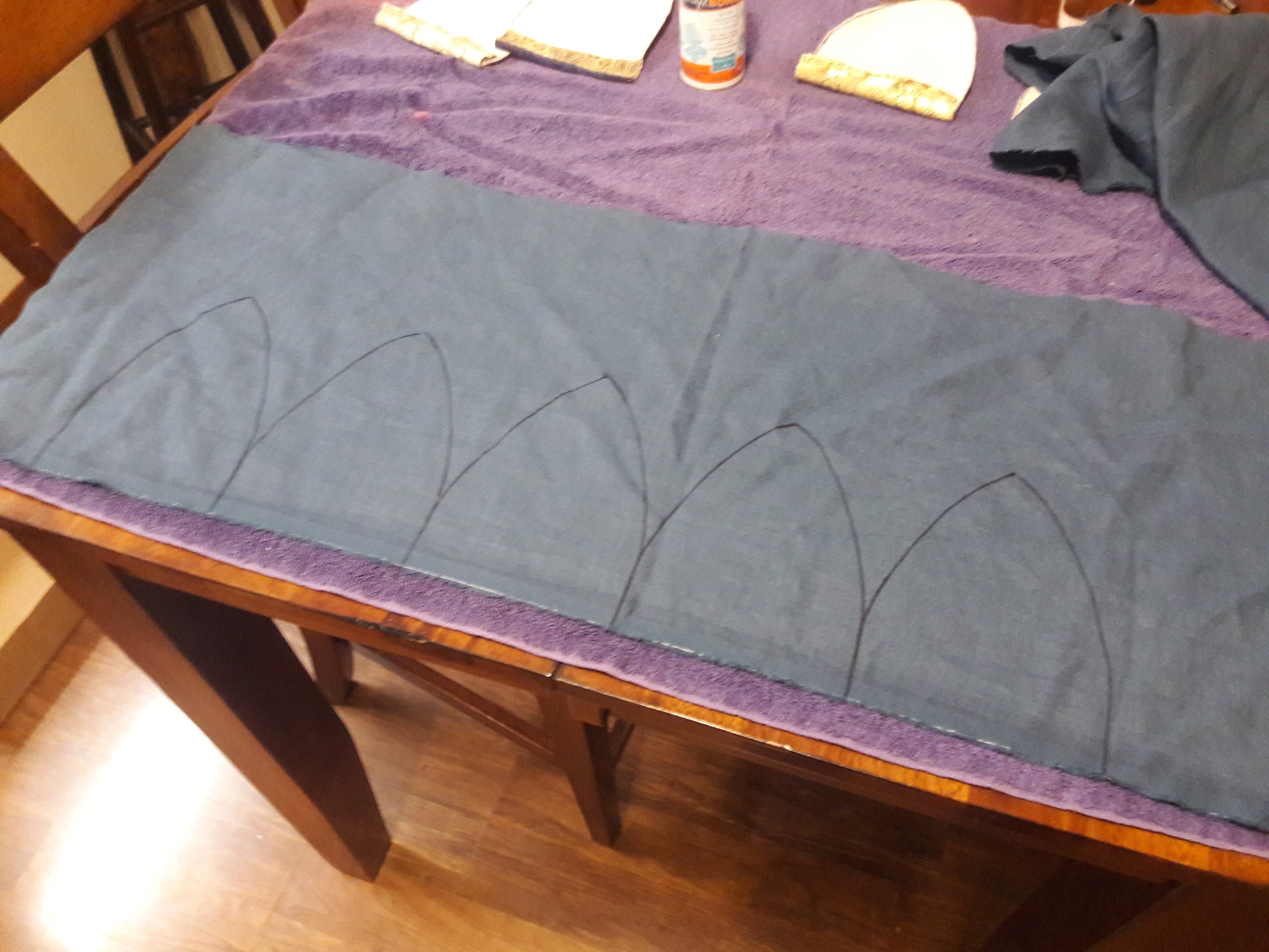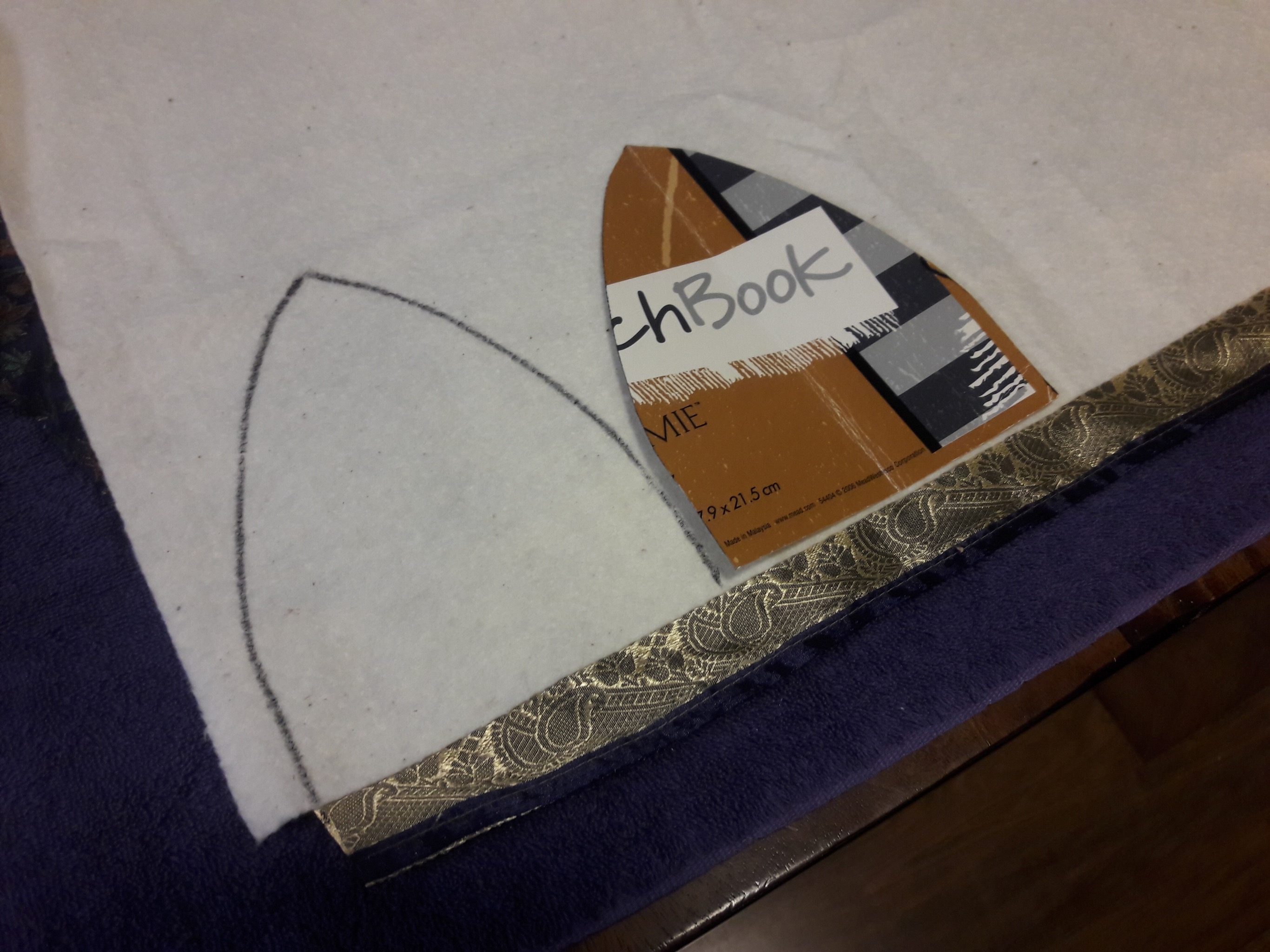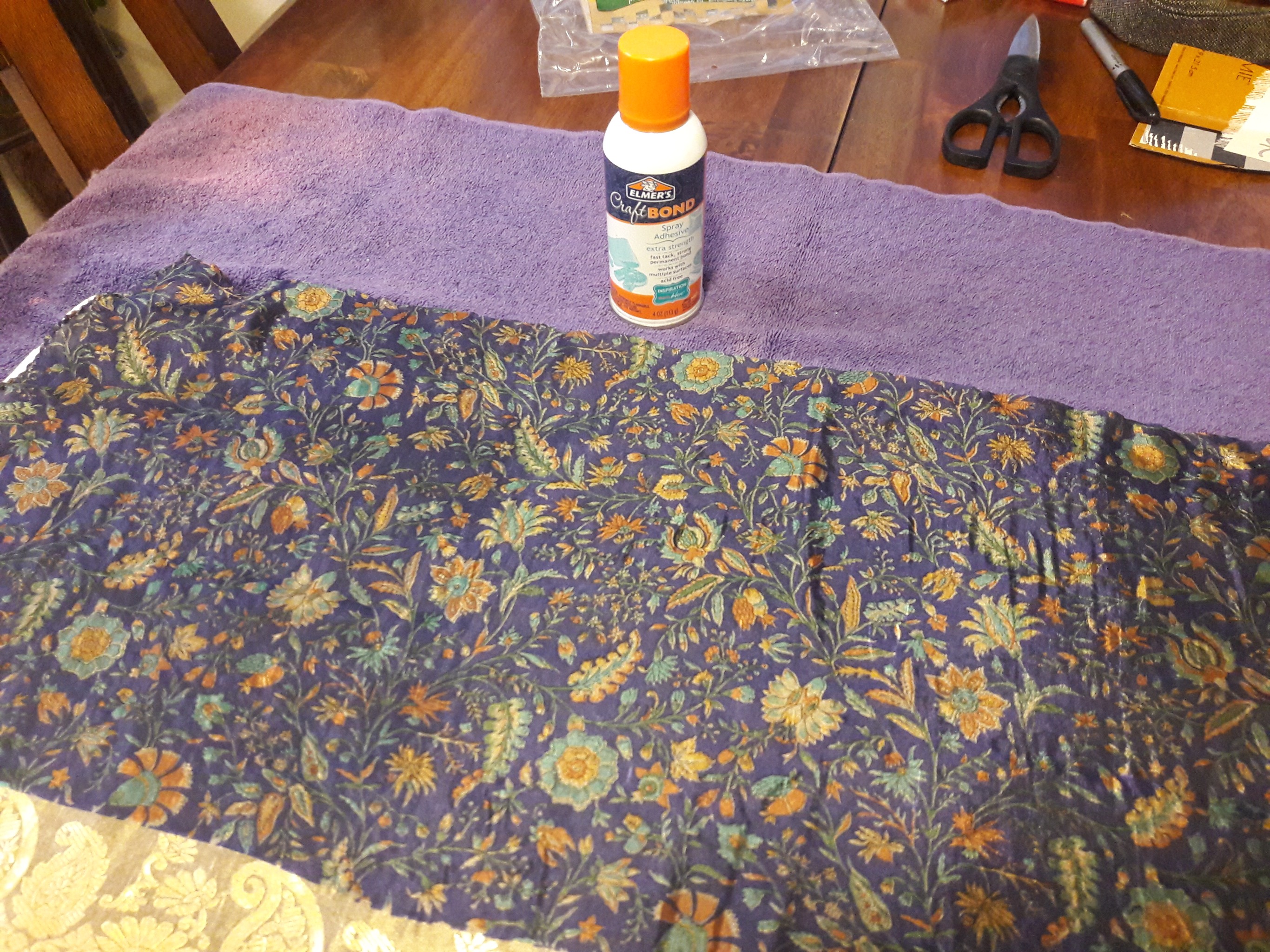 So, I am not the best at sewing. So for folks who actually sew, my methods may raise some eyebrows. Sorry. But, hey, we all have to start somewhere. The silk I used is difficult to handle and work with. It likes to slide around. So my first step was spray glueing it to some thin cotton batting, like what you would use for a quilt.