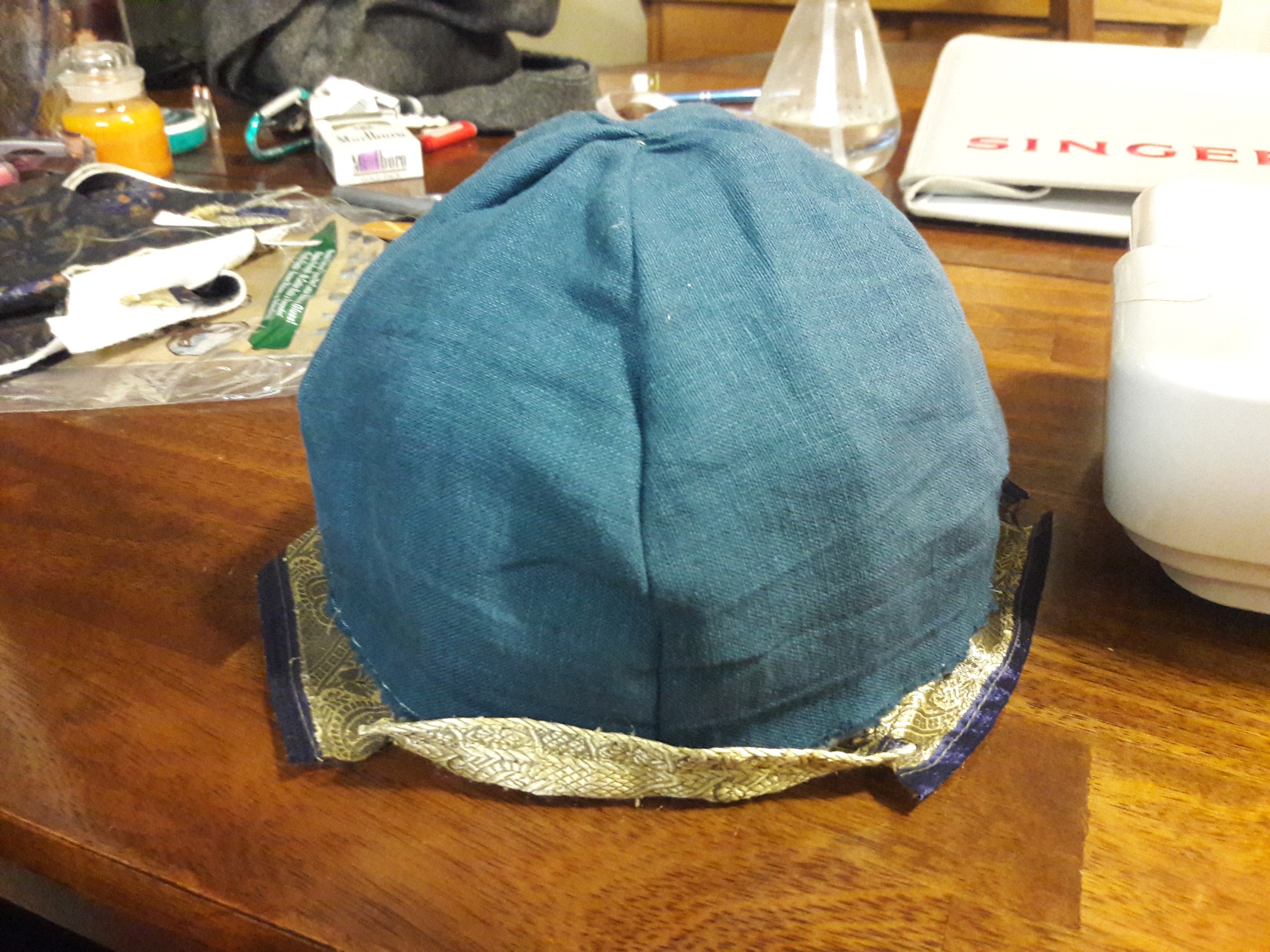 Then I patterned the scrap linen for the lining. I sewed the blue panels all together, then I sewed the silk panels all together. Then, with the silk side on the inside, I fit the two pieces together over my knee and worked them together until they were seated correctly.
