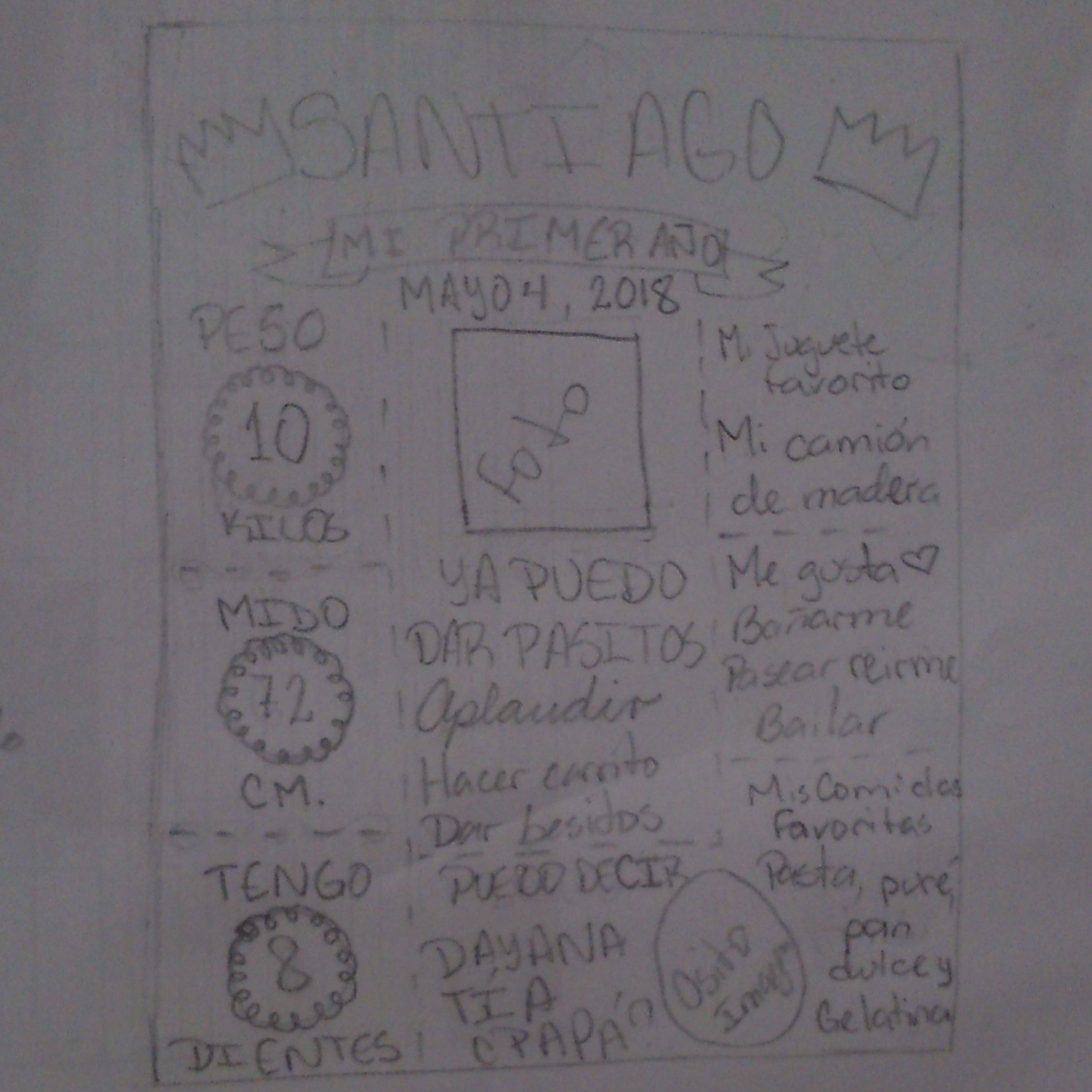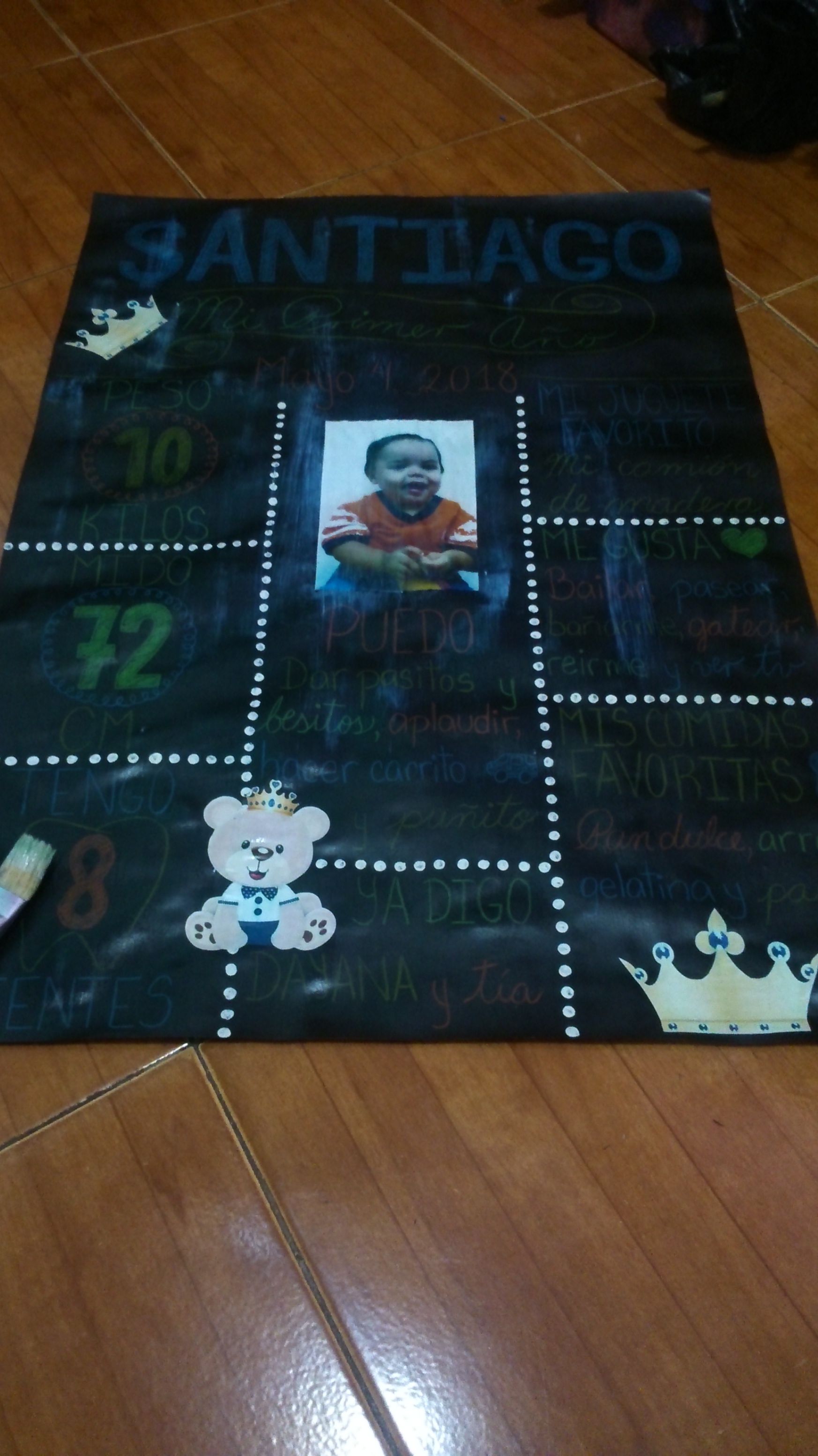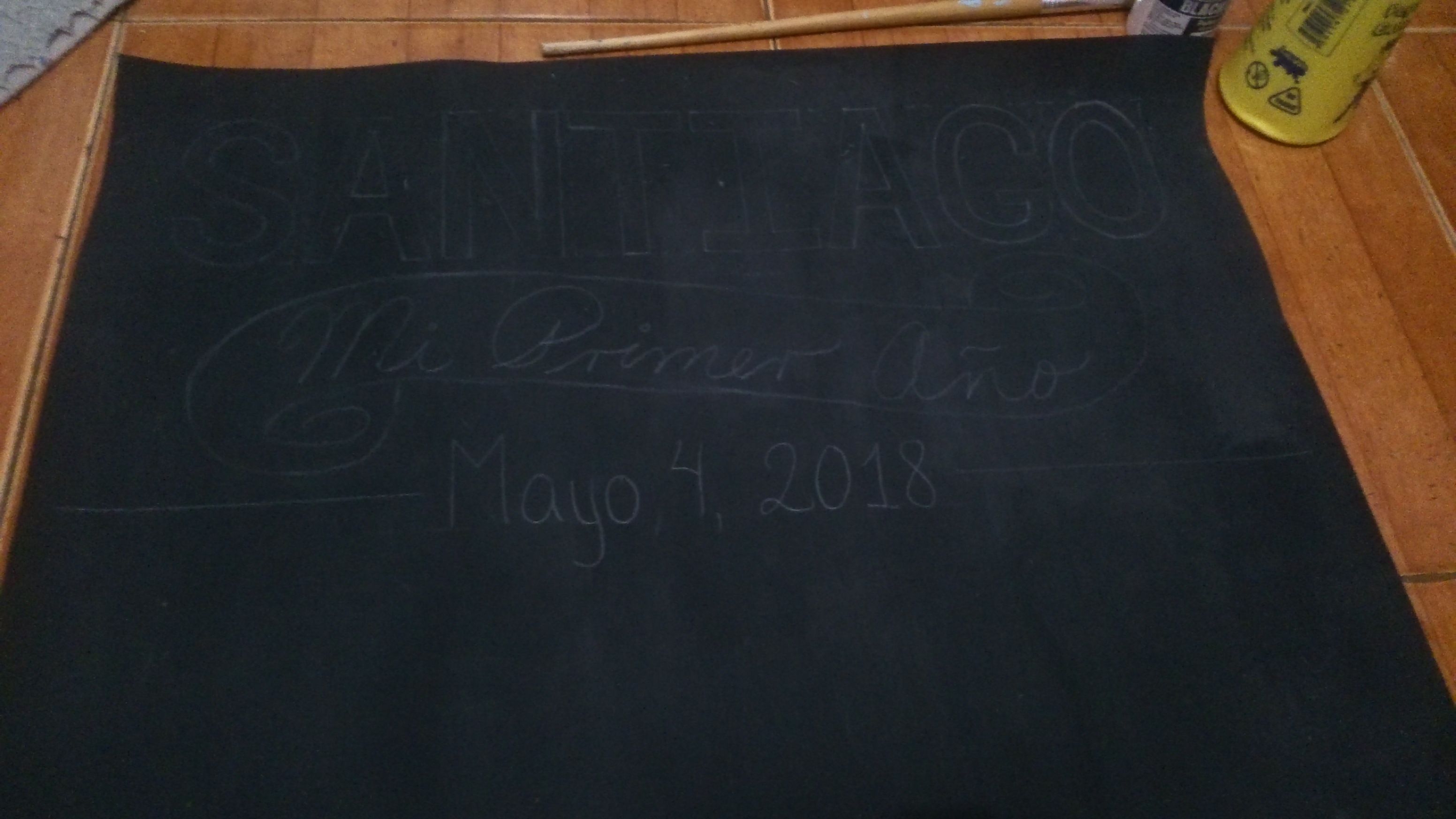 And started drawing my nephew's name, Santiago and below a ribbon with the sentence "My first year" and the date, May 4th 2018.