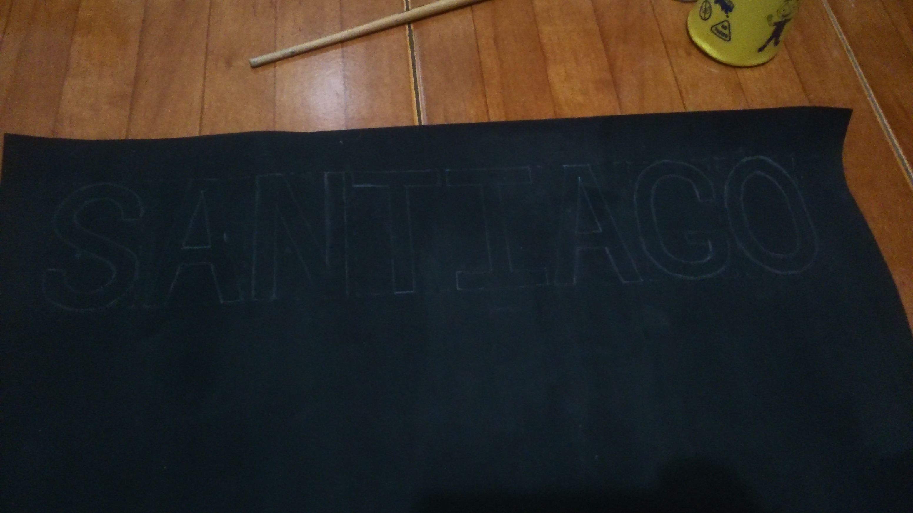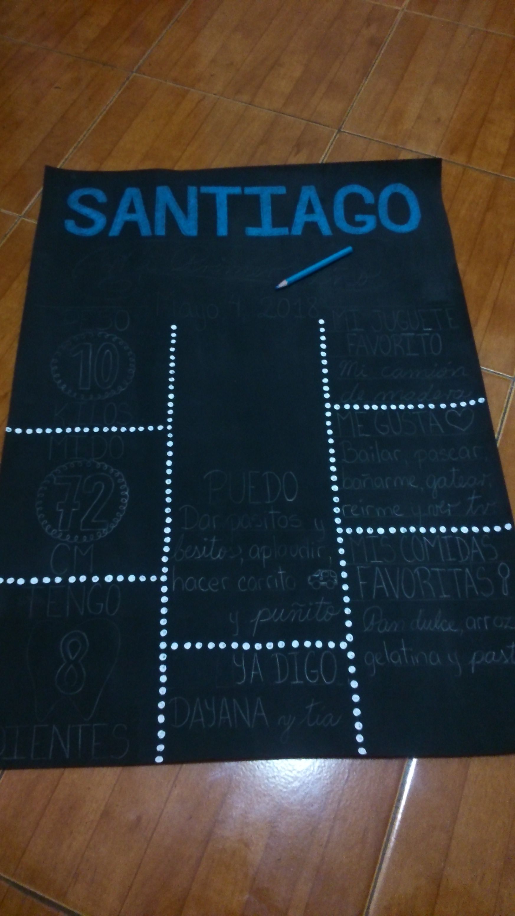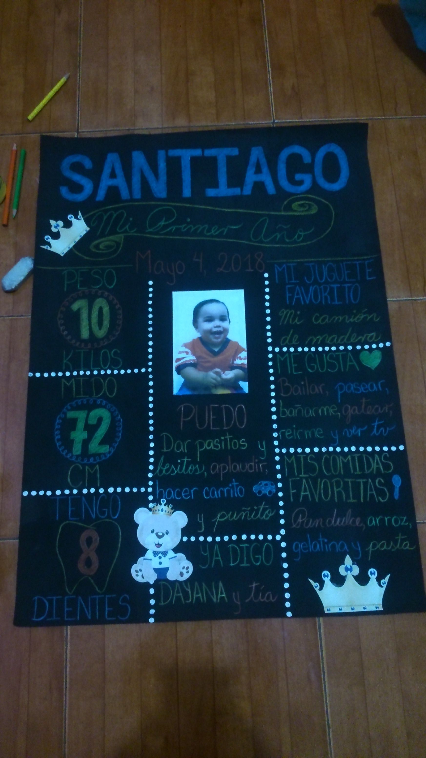 And started drawing my nephew's name, Santiago and below a ribbon with the sentence "My first year" and the date, May 4th 2018.