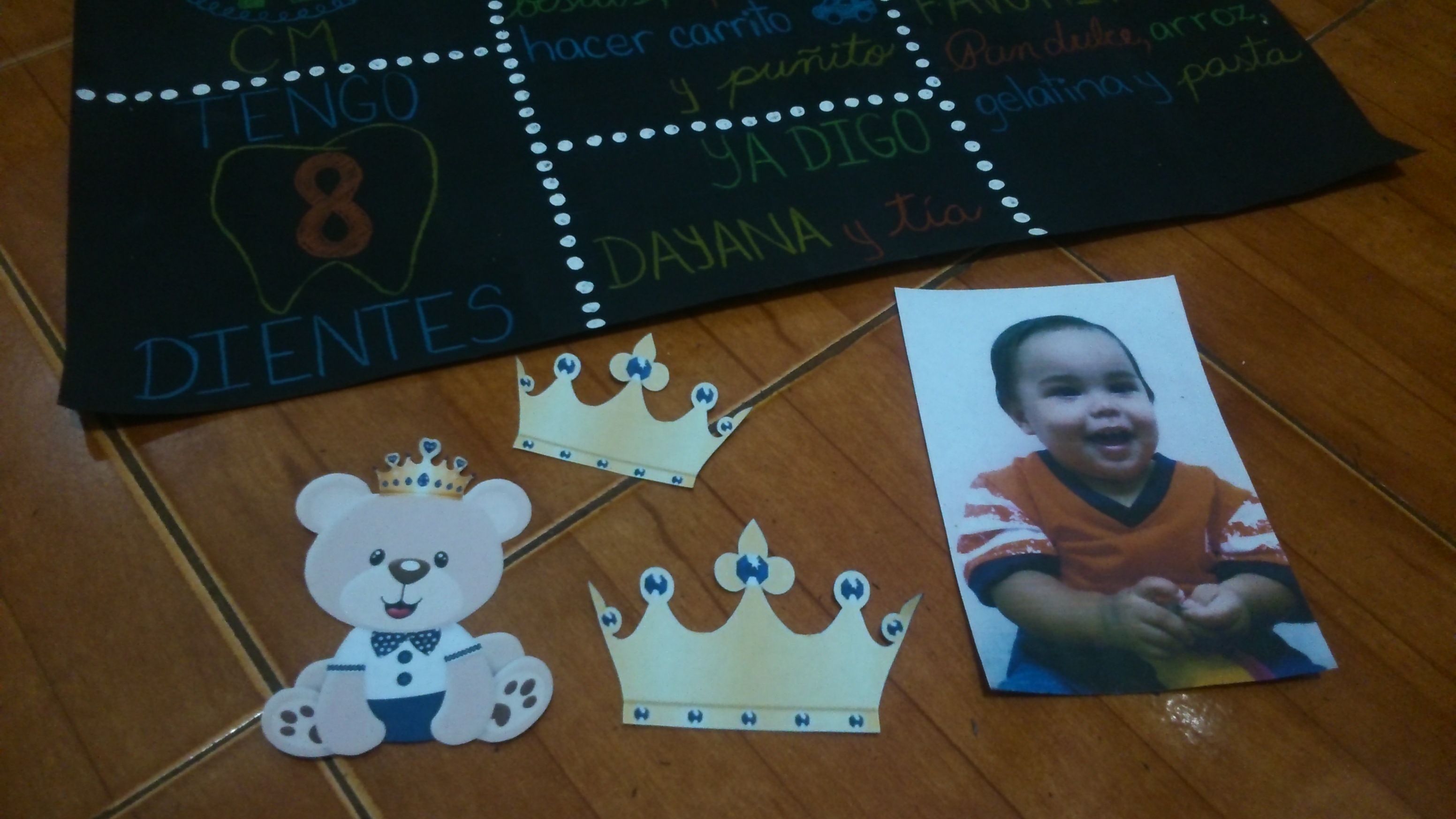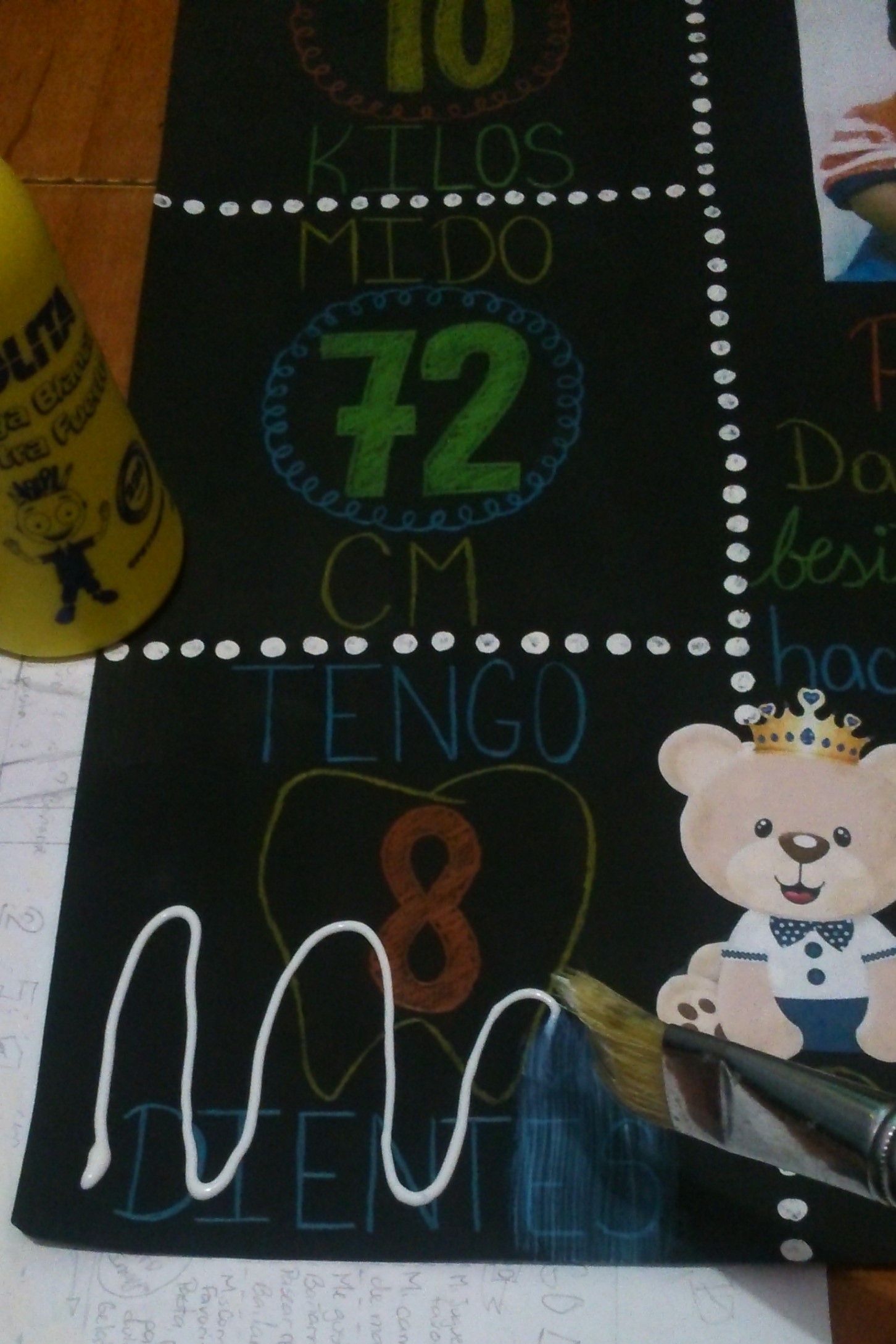 For this I only used a cardboard, black and white paints, a paint brush, crayons, glue, printable teddy bears (the party theme), and a picture of my nephew (also printed in normal paper).
