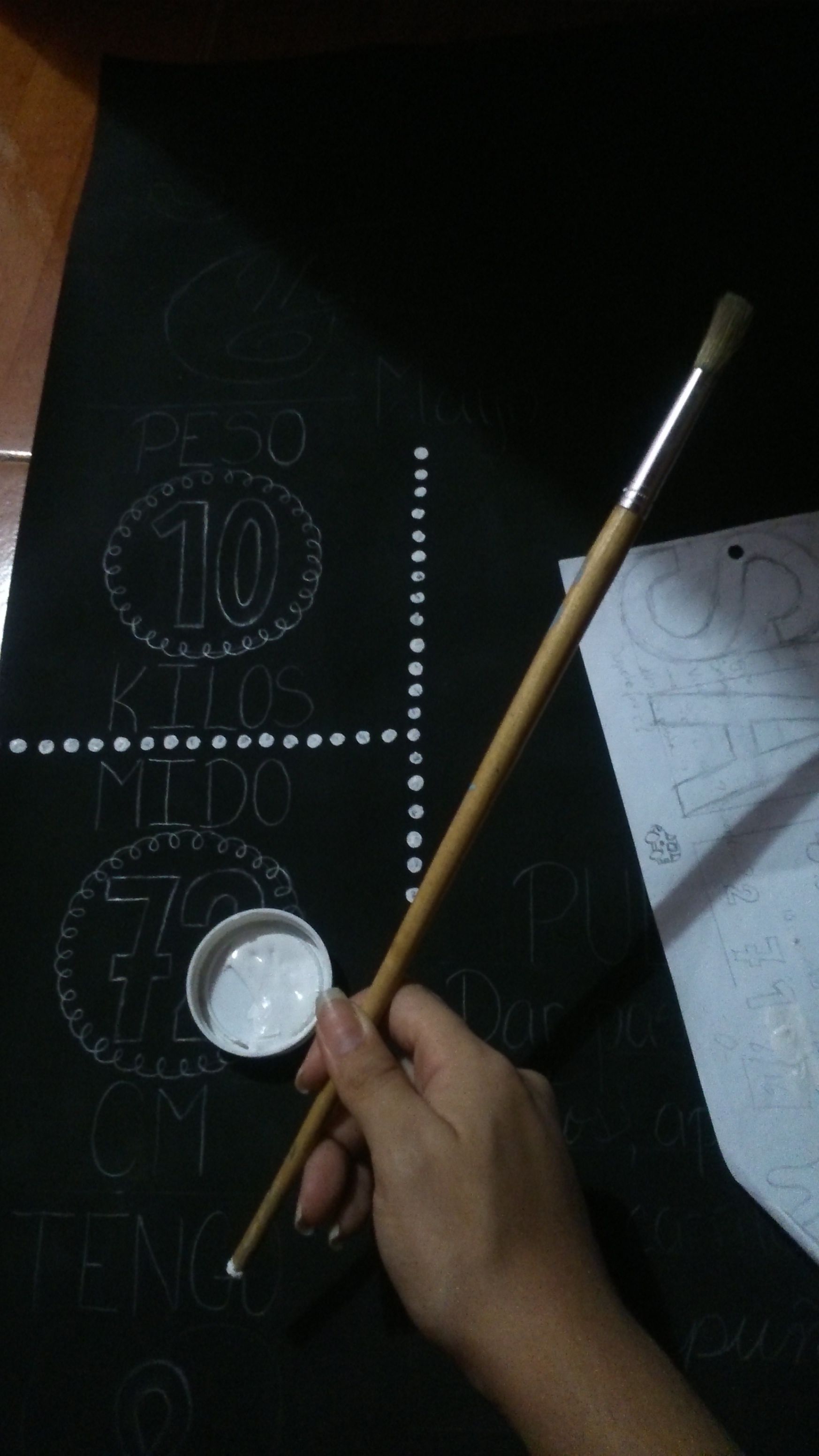 After having all finally writed I used the white paint and the end of the paint brush to make the dots to separate all the sections, is way easier than painting dot by dot with white crayon hahaha.
