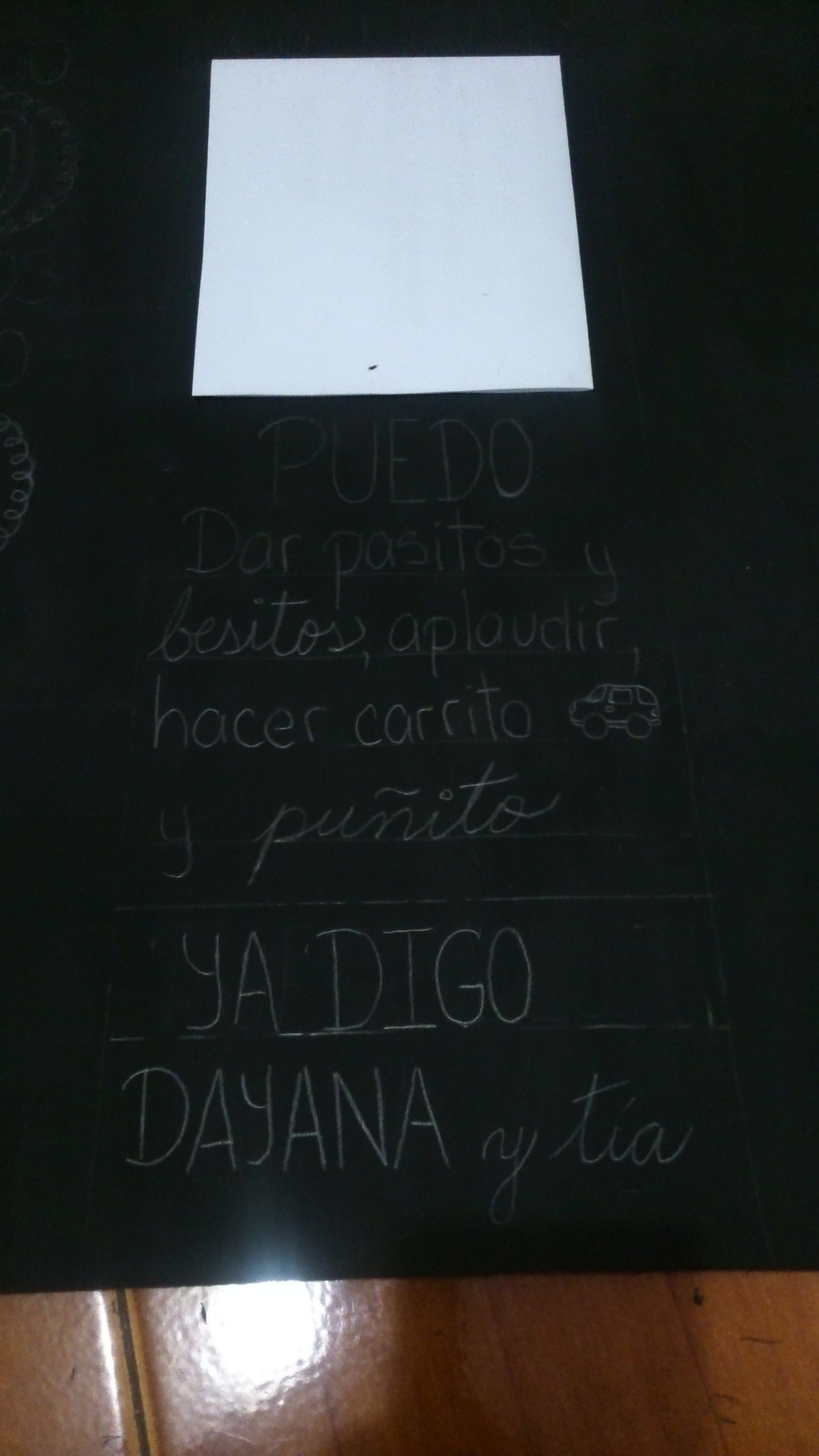 In the middle I leave the space for the picture and below it I made 2 sections, in the first I wrote "I can: Take little steps, blow kisses, clap, make a car with my mouth and give the fist" and drew a little car there, and in the other one "I can say: Dayana and aunt" (Dayana's his mother's name, for some reason in the world he never says mom, just her name)