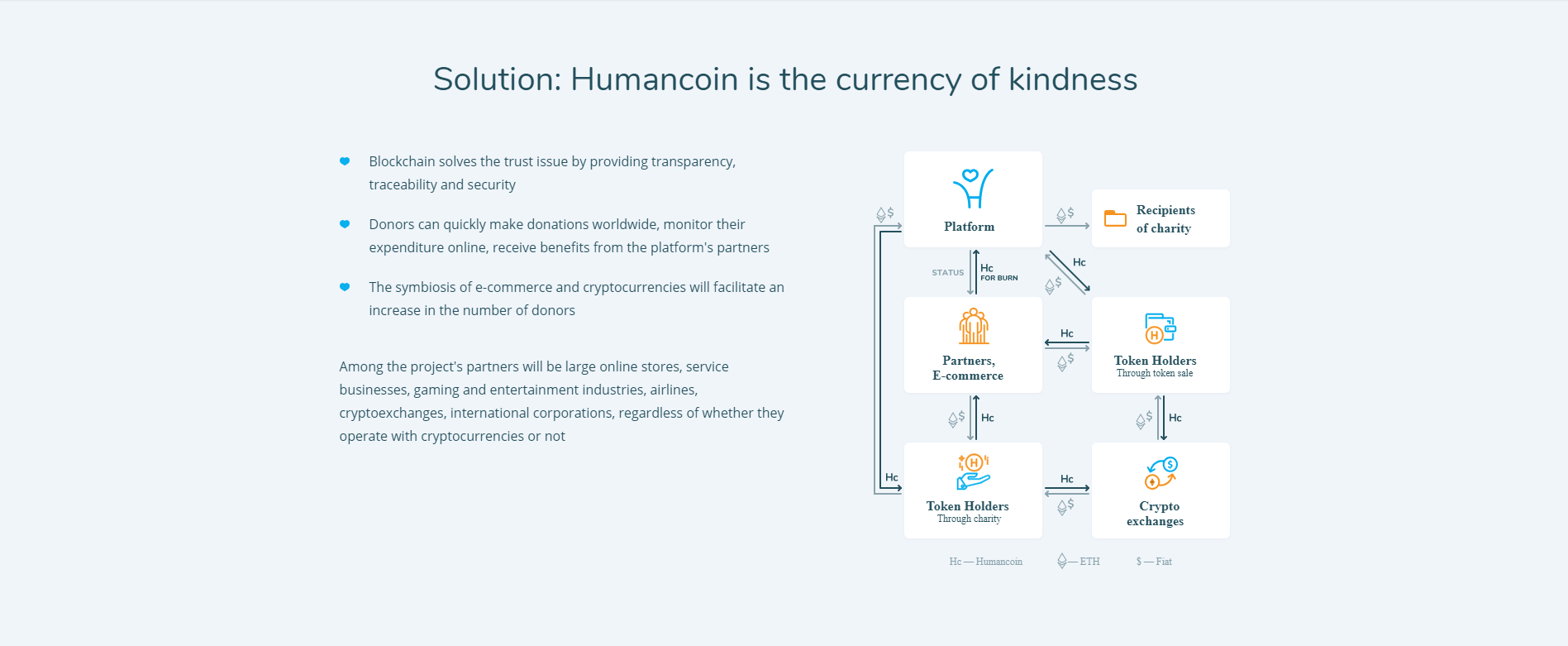 The creators of HumanCoin offered an excellent idea, namely, to connect all the participants of charity movement on one site, and with help of blockchain's technology to set up transactions.