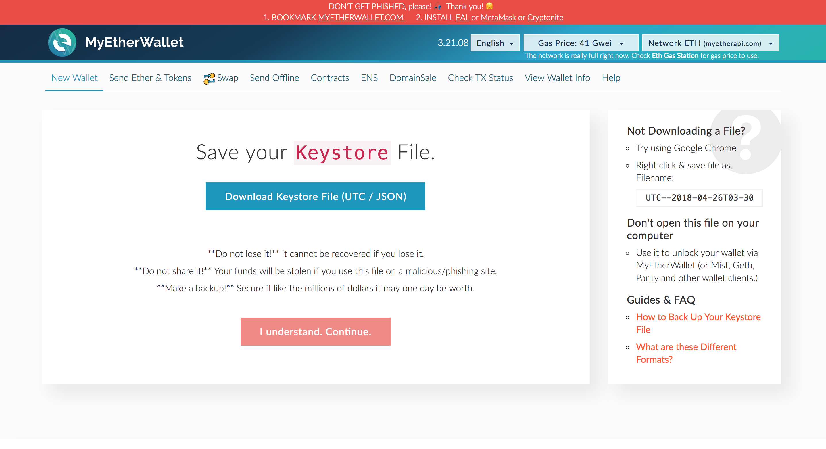 4.1 Keystore file contains wallet password and private key and you need it to login. Download and store it in a safe place, such as in your personal USB or external hard drive.