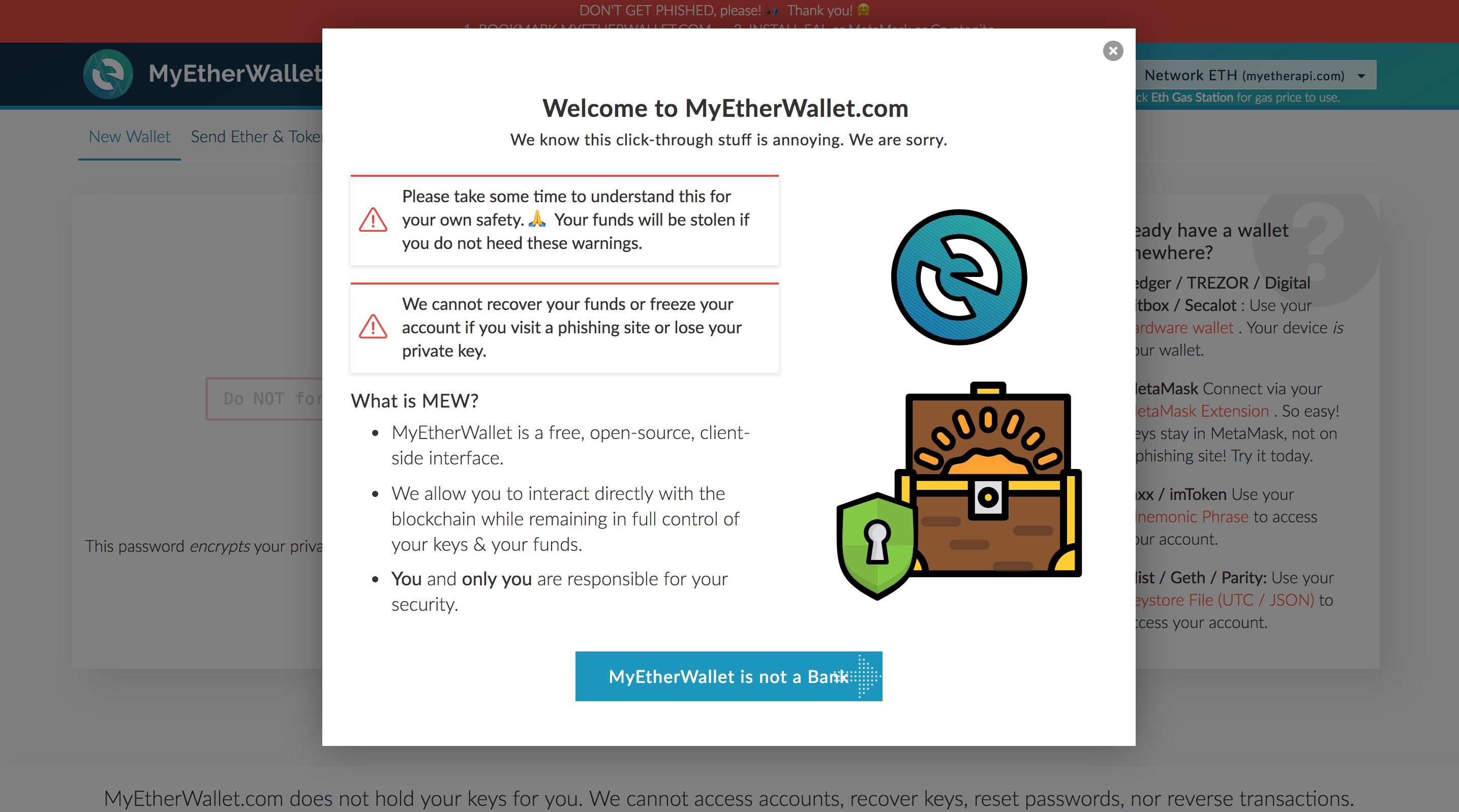 1.3 The pop-up contains introduction of MyEtherWallet and warnings. Click the blue button if you wish to continue reading, otherwise click the empty space around or X button to close it and proceed to create the wallet.