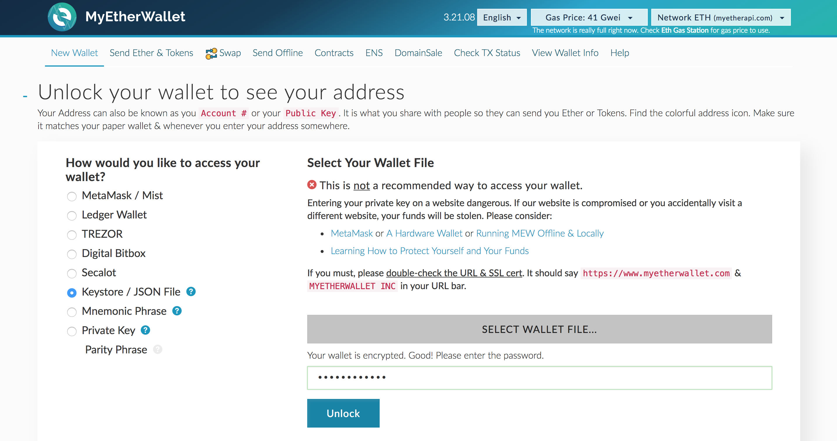 6.2 Click the “Select Wallet File…” button and choose your Keystore file that you downloaded earlier.