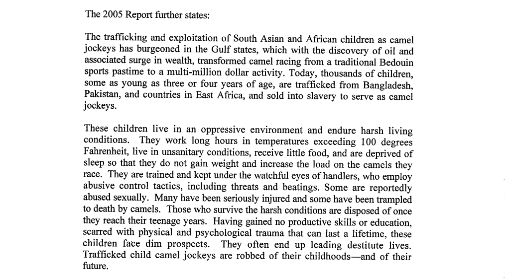 The complaint also highlights the fact that the US State Department’s 2005 TIP (Trafficking in Persons) Report for the UAE clearly demonstrates that the US government considers the camel jockey phenomenon as “slavery”.